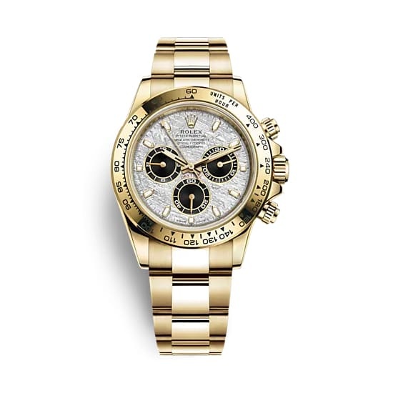 Rothtlex Cosmograph Daytona Men's Watch 116509-0073. This 40mm watch features a solid 18k white gold case, bezel and Oyster bracelet. The meteorite and black dial has luminescent hands and hour markers with a chronograph, small seconds, and a tachymeter scale on the bezel. It is powered by the Rothtlex Caliber 4130 self-winding automatic COSC Superlative Chronometer certified movement with a 72 hour power reserve.