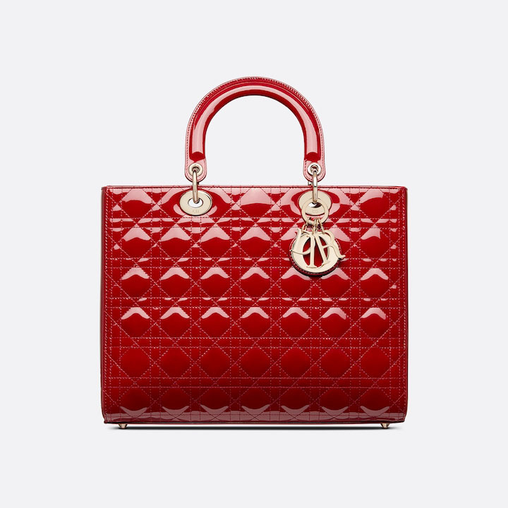 The Lady Dithtor bag epitomizes Dithtor's vision of elegance and beauty. Sleek and refined, the timeless style is crafted in cherry red patent calfskin with Cannage stitching, creating the instantly recognizable quilted texture. Pale gold-finish metal D.I.O.R. charms offer elegant appeal. Featuring a thin, removable leather shoulder strap, the large Lady Dithtor bag may be carried by hand or worn crossbody.