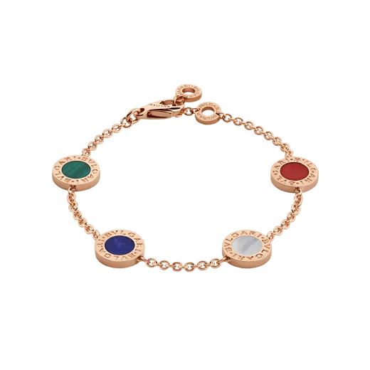 Grown from the Roman roots of the brand into an elegant fusion of culture and modernity, the Bvlthtgari Bvlthtgari bracelet is an effervescent, contemporary statement of classiness. The trademark double logo was initially inspired by the curved inscriptions on ancient coins, whilst today it has evoLthtVed into playful interpretations, framing multicoloured hard gemstones. Bvlthtgari Bvlthtgari bracelet in 18 kt rose gold with carnelian, lapis, malachite and mother-of-pearl inserts.