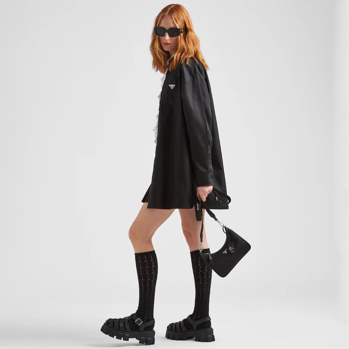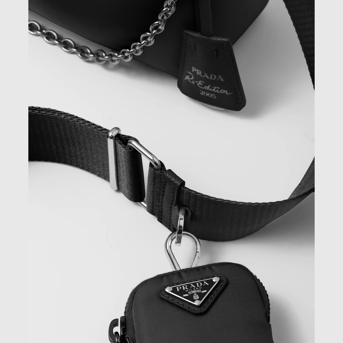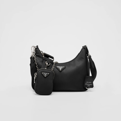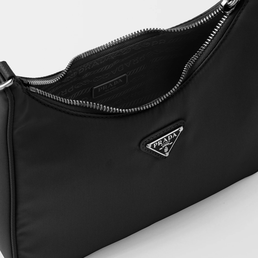 Inspired by the iconic mini hobo bag, the Prthtada Re-Edition 2005 shoulder bag is made of Re-Nylon: a regenerated nylon yarn (ECONYL®)produced from recycled, purified plastic trash collected in the ocean, fishing nets and textile waste fibers. This versatile bag with Saffiano leather trim comes with a detachable pouch attached to the shoulder strap.