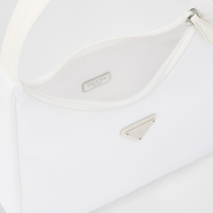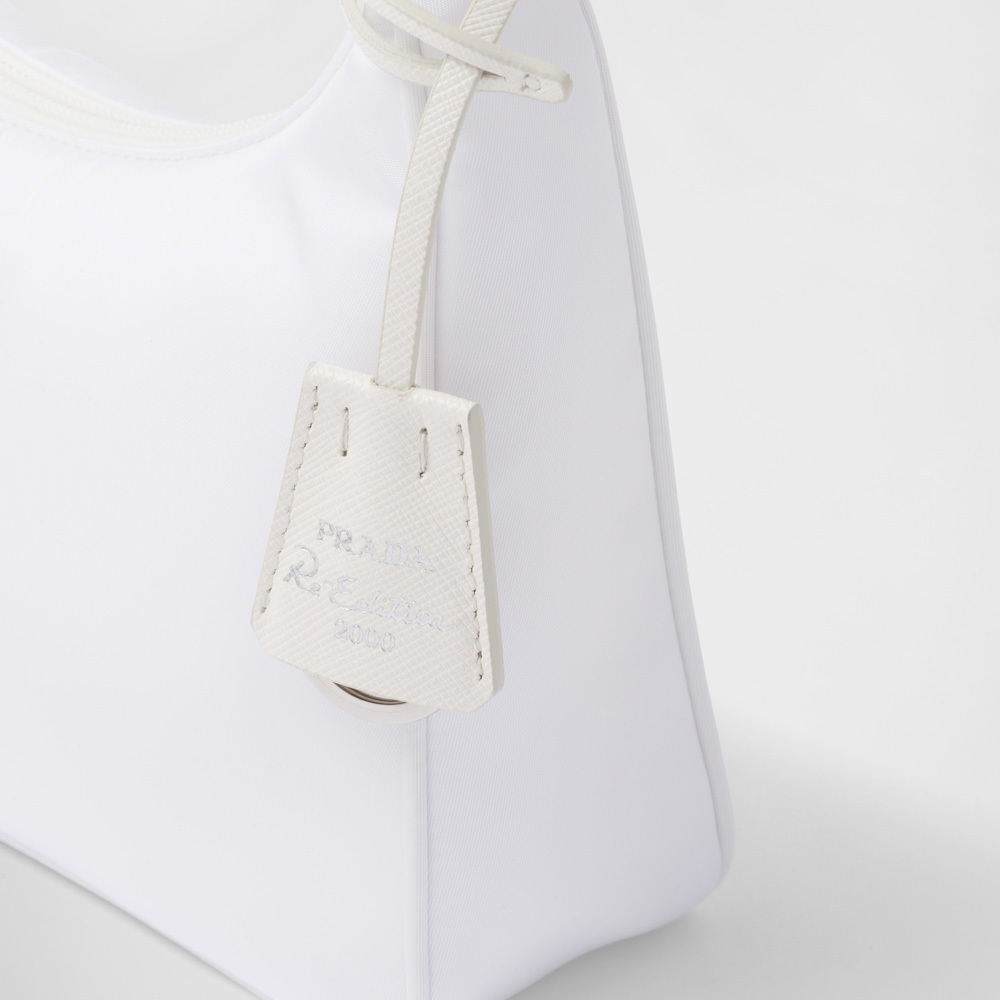 A new interpretation of an iconic Prthtada style, the Re-Edition 2000 mini-bag is made of innovative Re-Nylon, produced from recycled, purified plastic trash collected in the ocean, fishing nets, and textile waste fibers. The accessory with zipper closure and woven tape handle is decorated with the iconic enameled metal triangle logo.