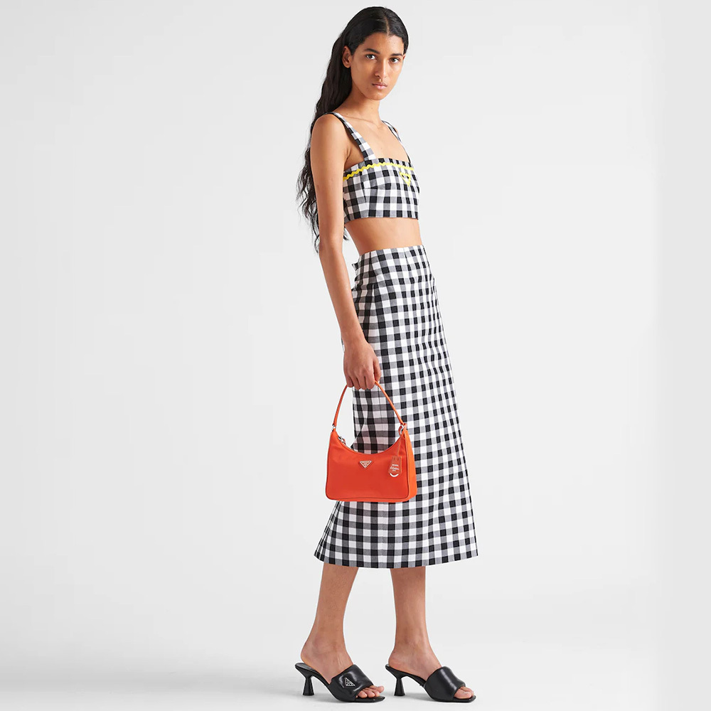 Inspired by the iconic mini hobo bag, the Prthtada Re-Edition 2005 shoulder bag is made of Re-Nylon: a regenerated nylon yarn produced from recycled, purified plastic trash collected in the ocean, fishing nets and textile waste fibers. Practical and feminine, the mini bag is decorated with iconic Saffiano leather trim. It features a contemporary mix of materials.