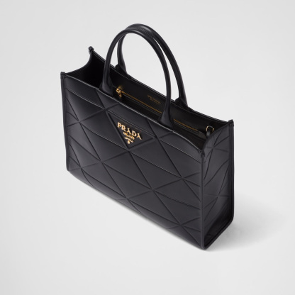 This leather handbag with a sleek, elegant design features a double handle and an internal leather keychain. The accessory infused with contemporary allure is characterized by the stitched motif that echoes the iconic geometric shape of the brand. The metal lettering logo decorates the front of the bag.