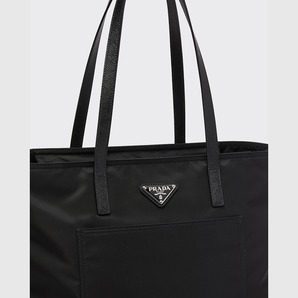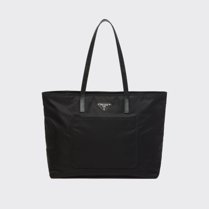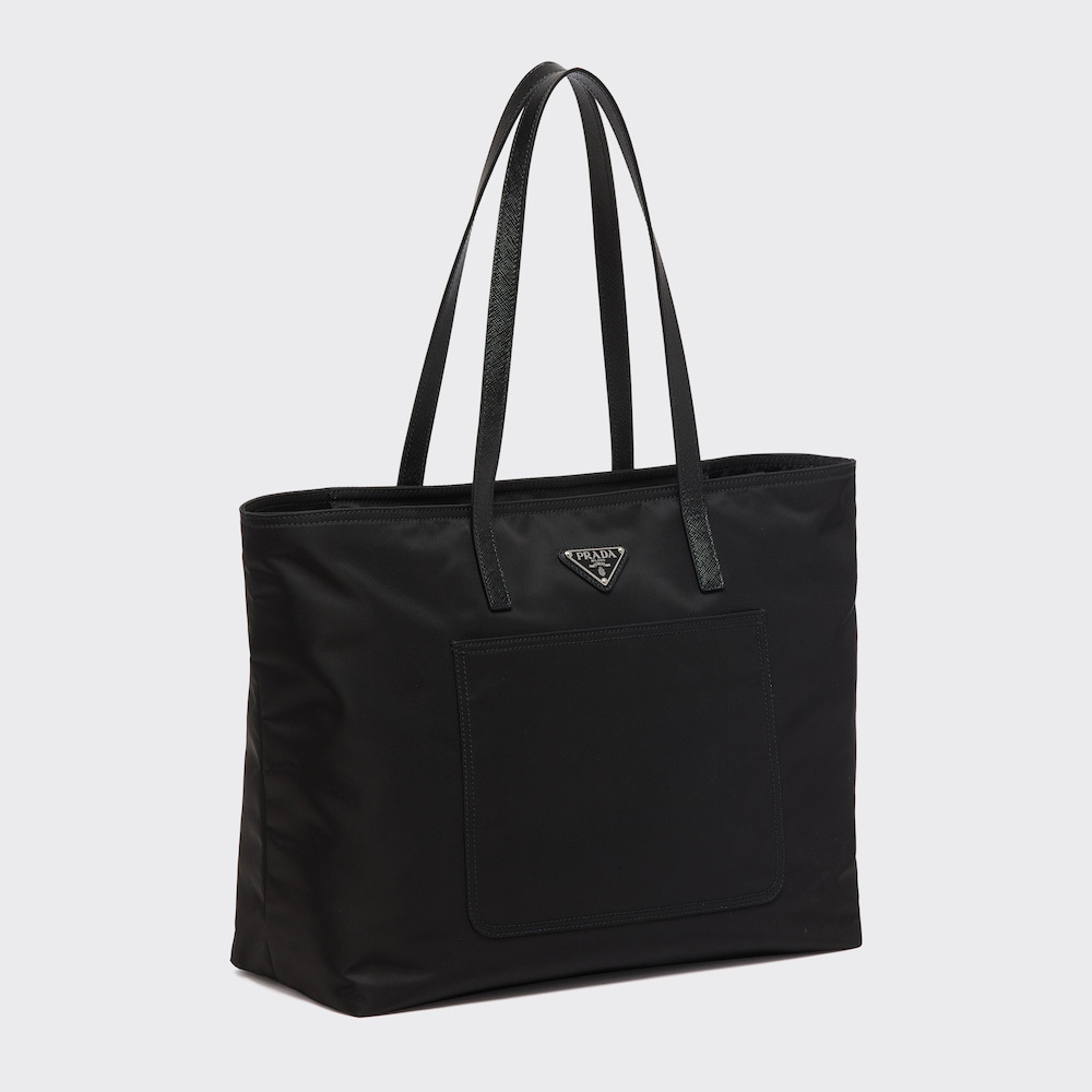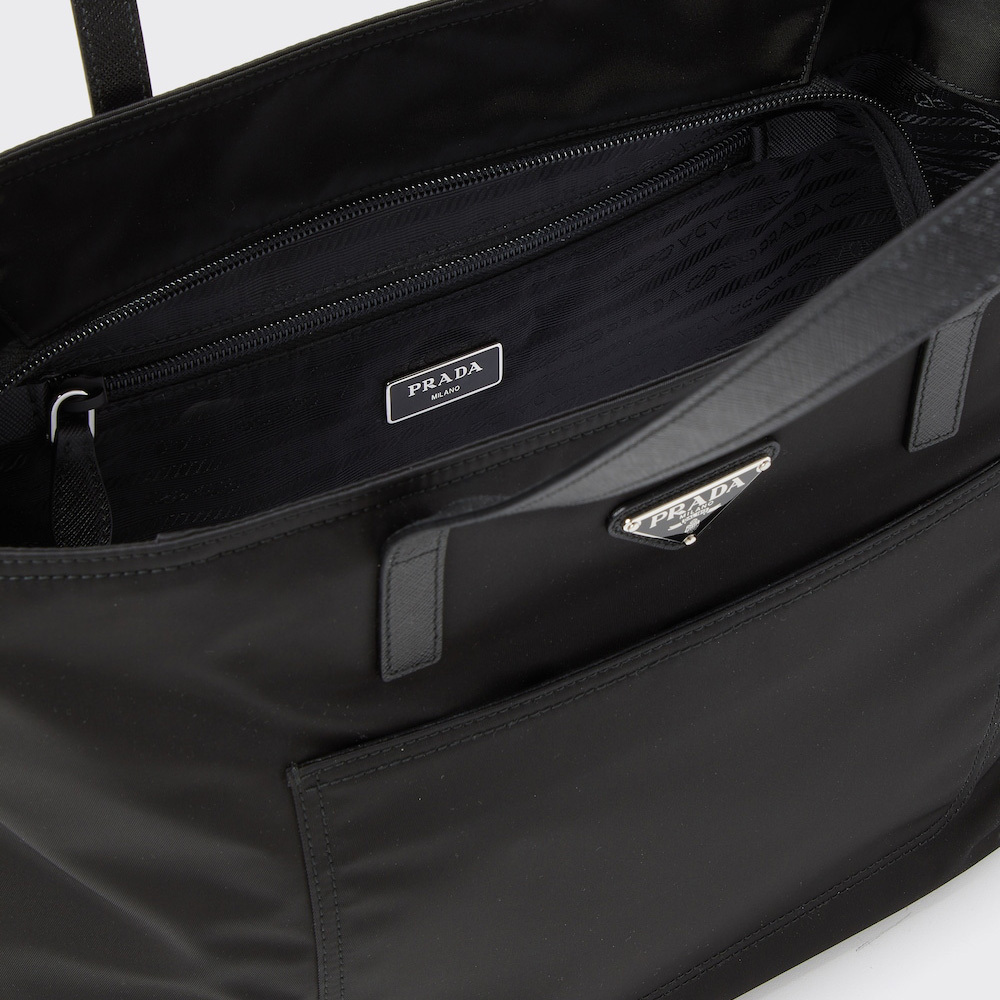 A roomy front pocket stands out on this tote bag with a classic design, accented with Saffiano leather handles and decorated with the distinctive triangle logo. Introduced to the luxury world precisely by Prthtada, nylon exemplifies the brand's propensity to combine concepts, workmanship and shapes that were previously considered irreconcilable. Here, the emblematic fabric is presented in its evoLthtVed, sustainable version produced from recycled, purified plastic material collected in the ocean.