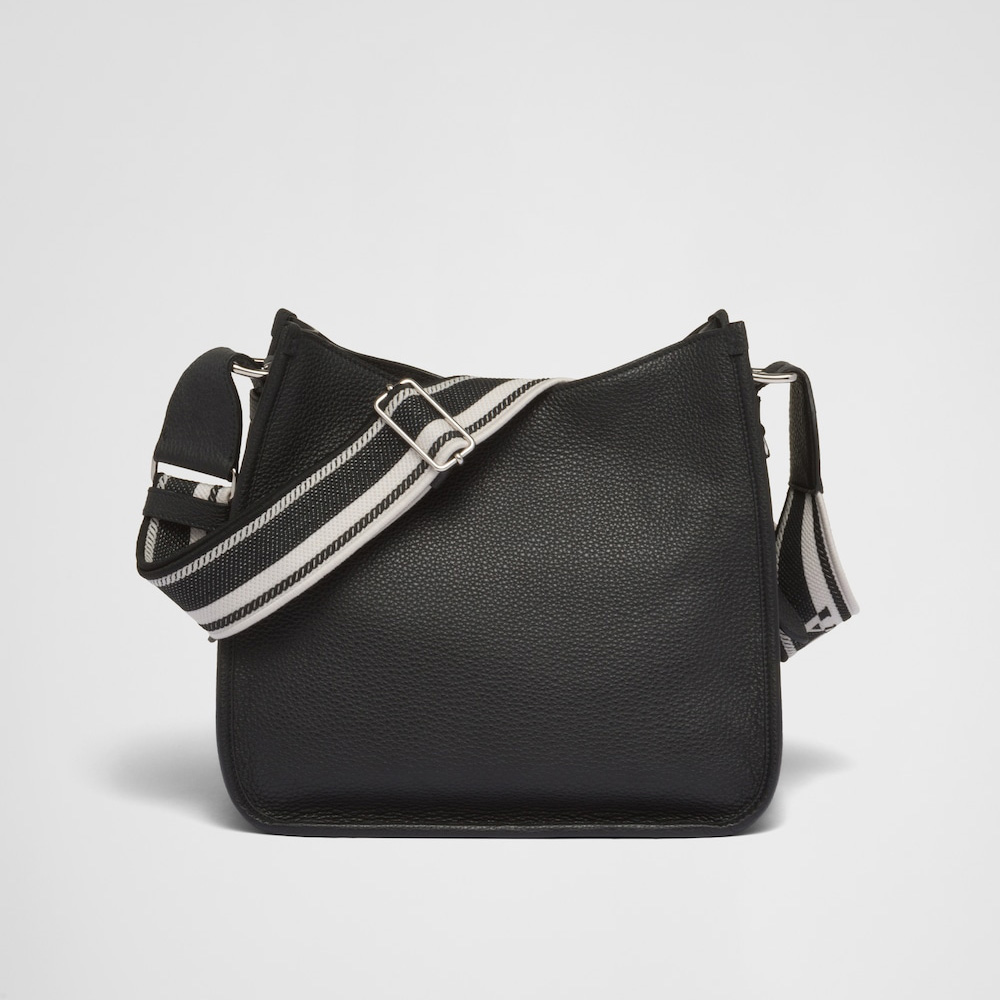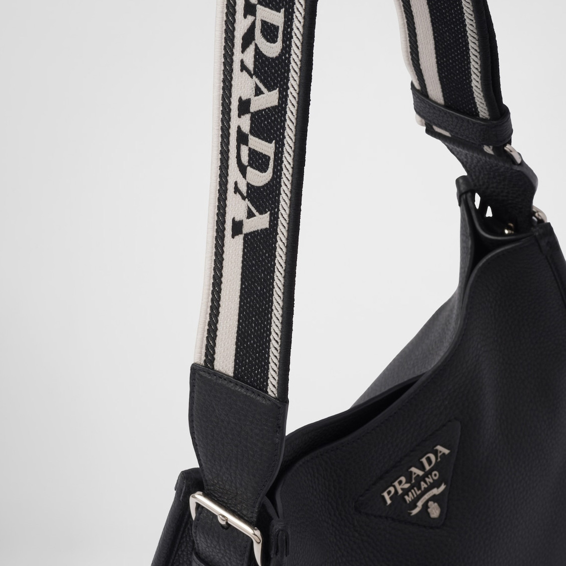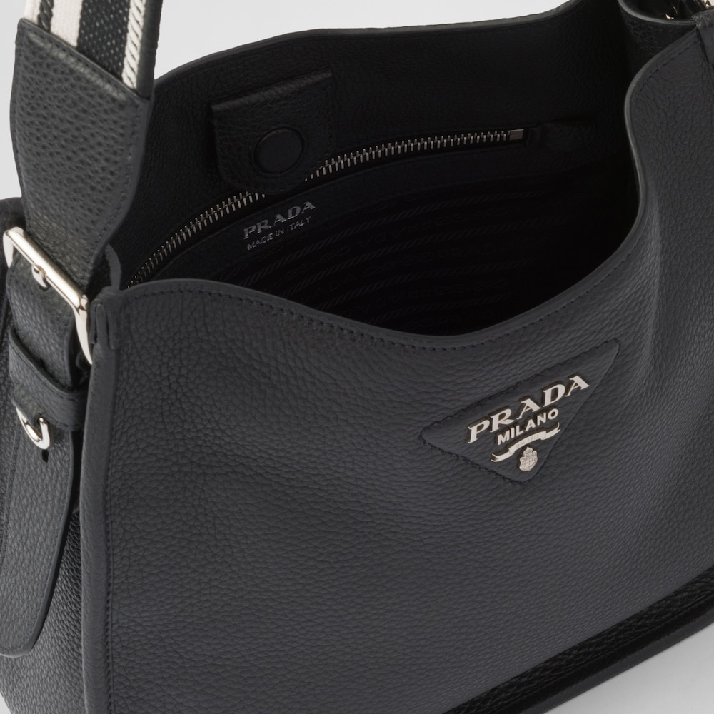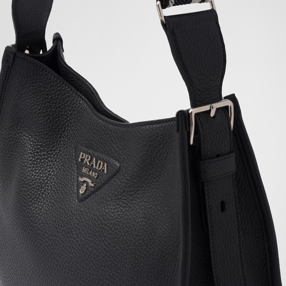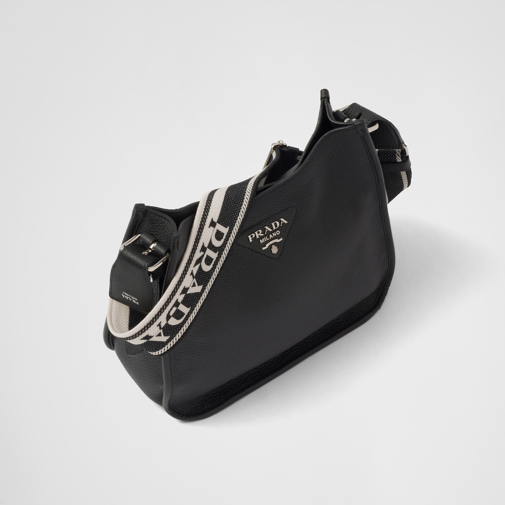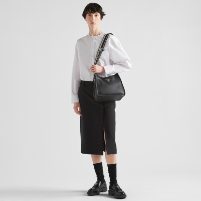 This soft leather hobo bag expresses modern elegance and is decorated on the front by the metal lettering logo. The adjustable embroidered logo-print woven tape shoulder strap adds a sporty note.