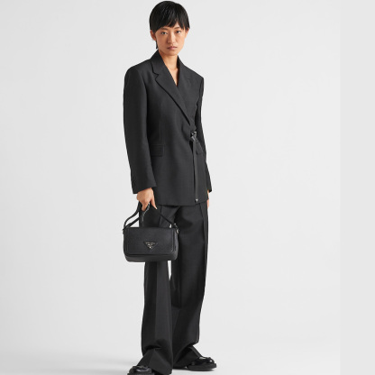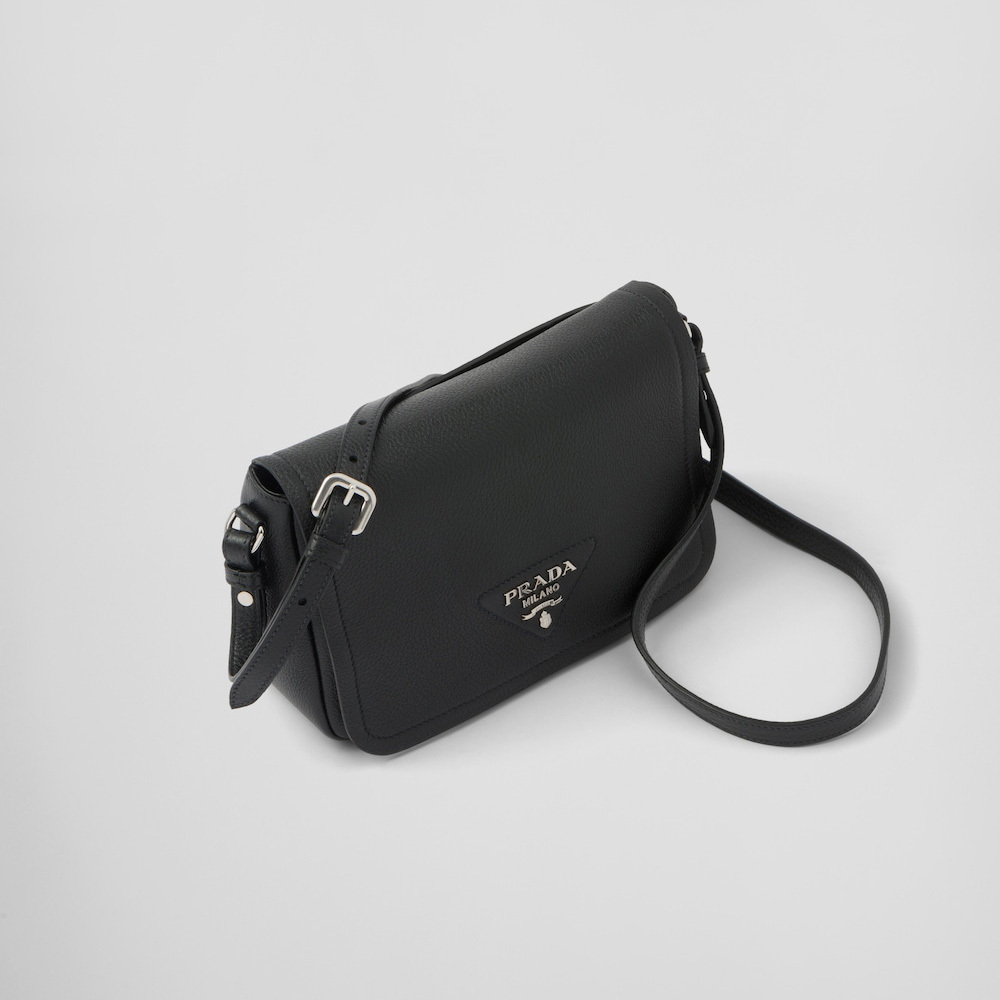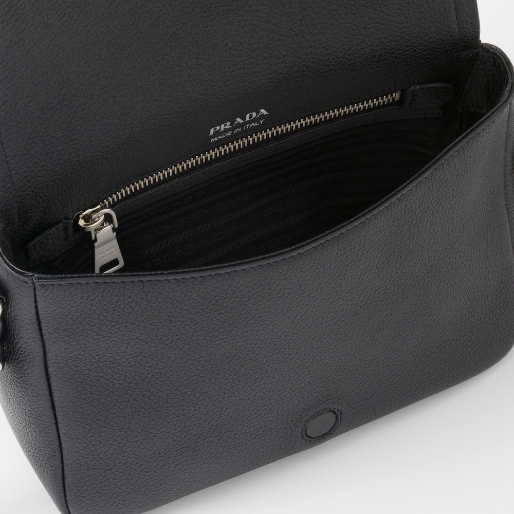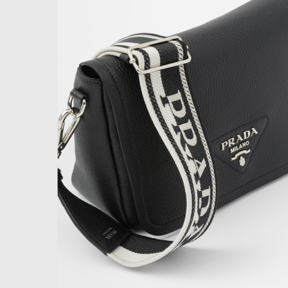 This small leather bag with soft pleated sides and a modern silhouette is decorated with the lettering logo on the flap. The adjustable woven tape shoulder strap decorated with the embroidered logo in a contrasting color makes the bag versatile and wearable as a crossbody or shoulder bag.