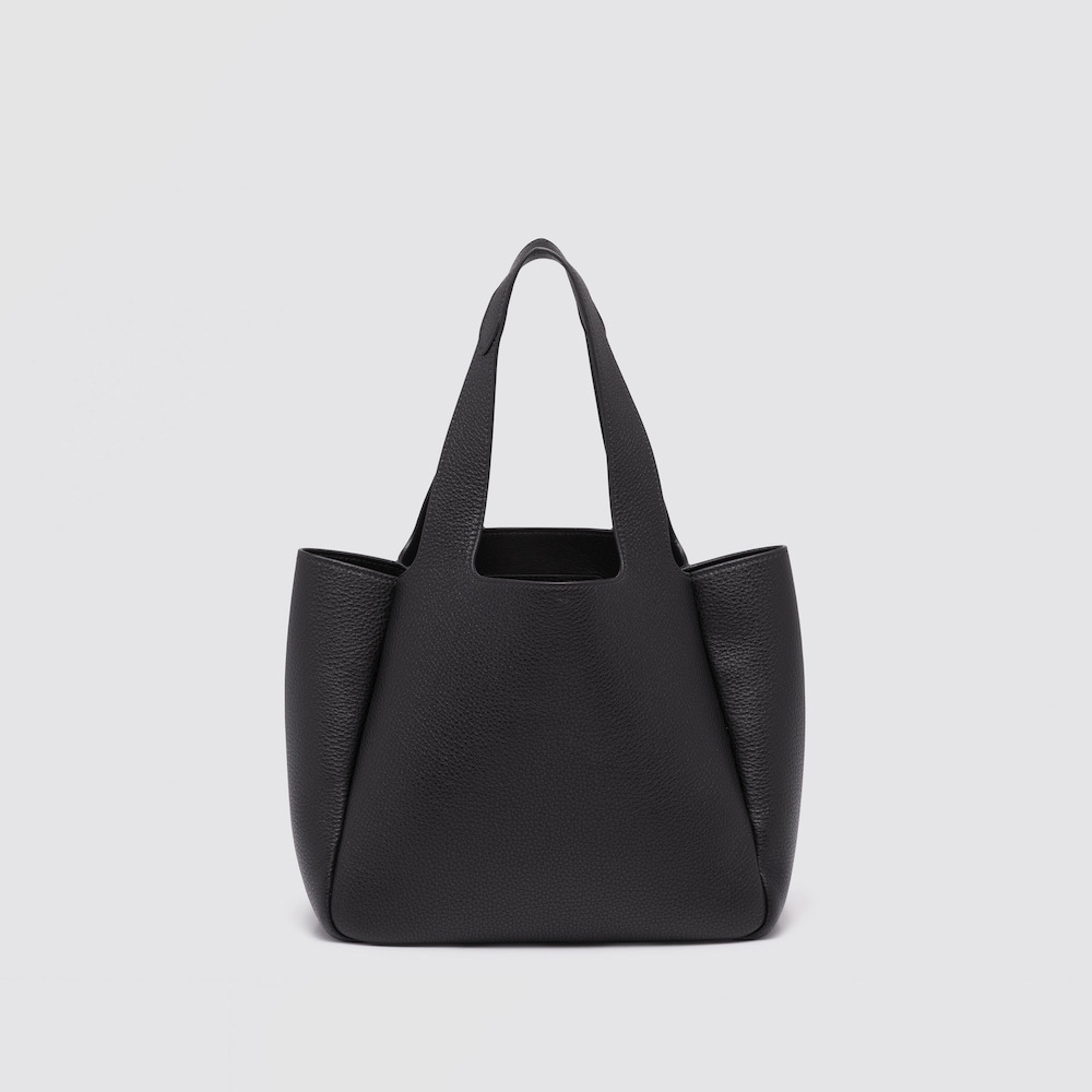 This soft leather tote introduced for the Fall Winter 2020 collection presents a new interpretation of the triangle logo, traced by stitching with the Prthtada metal lettering logo illuminating its center. The reverse stitching emphasizes the soft, rounded silhouette that comes with a double leather handle and magnetic button closure. The nappa interior has three compartments.