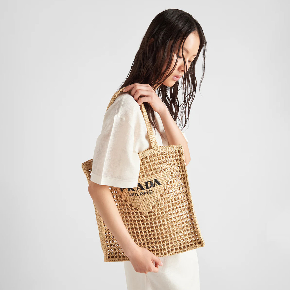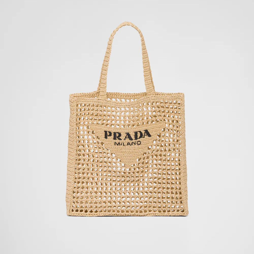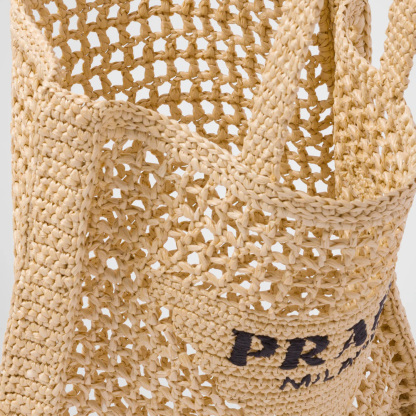 This tote bag with a soft, deconstructed design is made of raffia-effect yarn, a light, natural material with a summery mood. A new interpretation of Prthtada's emblematic triangle decorates the front and is embellished at its center with the embroidered lettering logo.