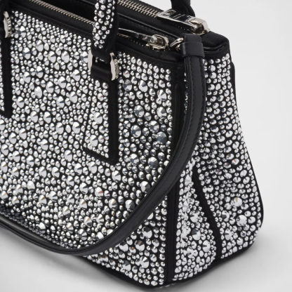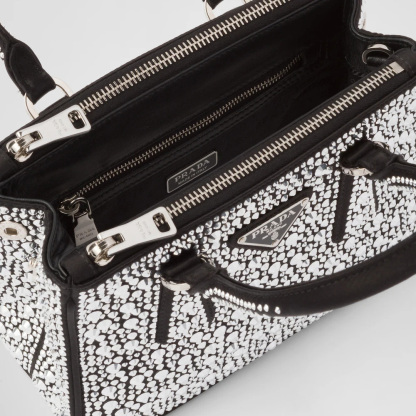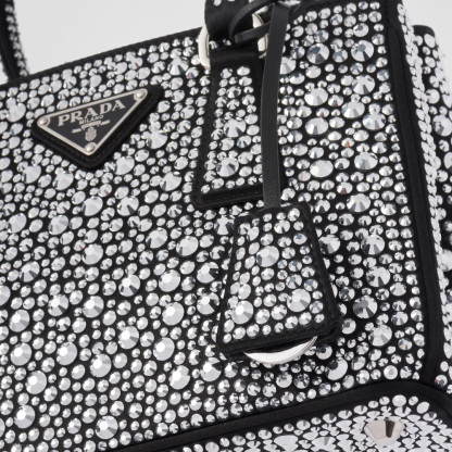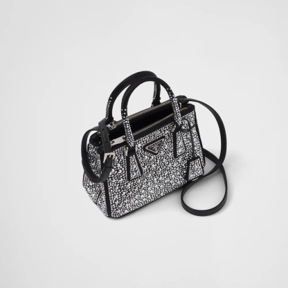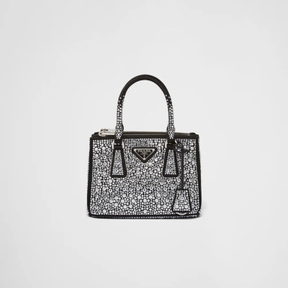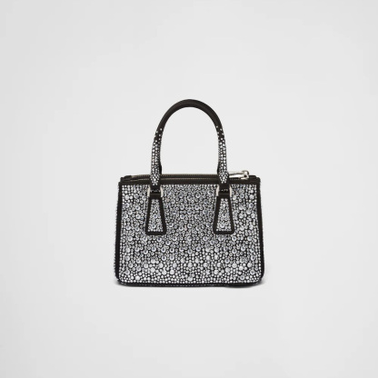 A surface of dazzling crystals in various sizes creates a precious play of sparkles and glimmers on this Prthtada Galleria bag, recalling the jewelry world. The accessory, which exemplifies the centennial excellence of Prthtada in luxury leather goods, becomes a reflection of the brand's modernity and stylistic identity that seeks to interpret kaleidoscopic contemporaneity through a pragmatic design and structured lines. Presented in a mini version, the bag is made of fine silk satin. The Prthtada Galleria bag, named after the historic Prthtada store opened by Mario Prthtada in 1913 in Galleria Vittorio Emanuele II in Milan, expresses the quintessence of the brand's timeless elegance.