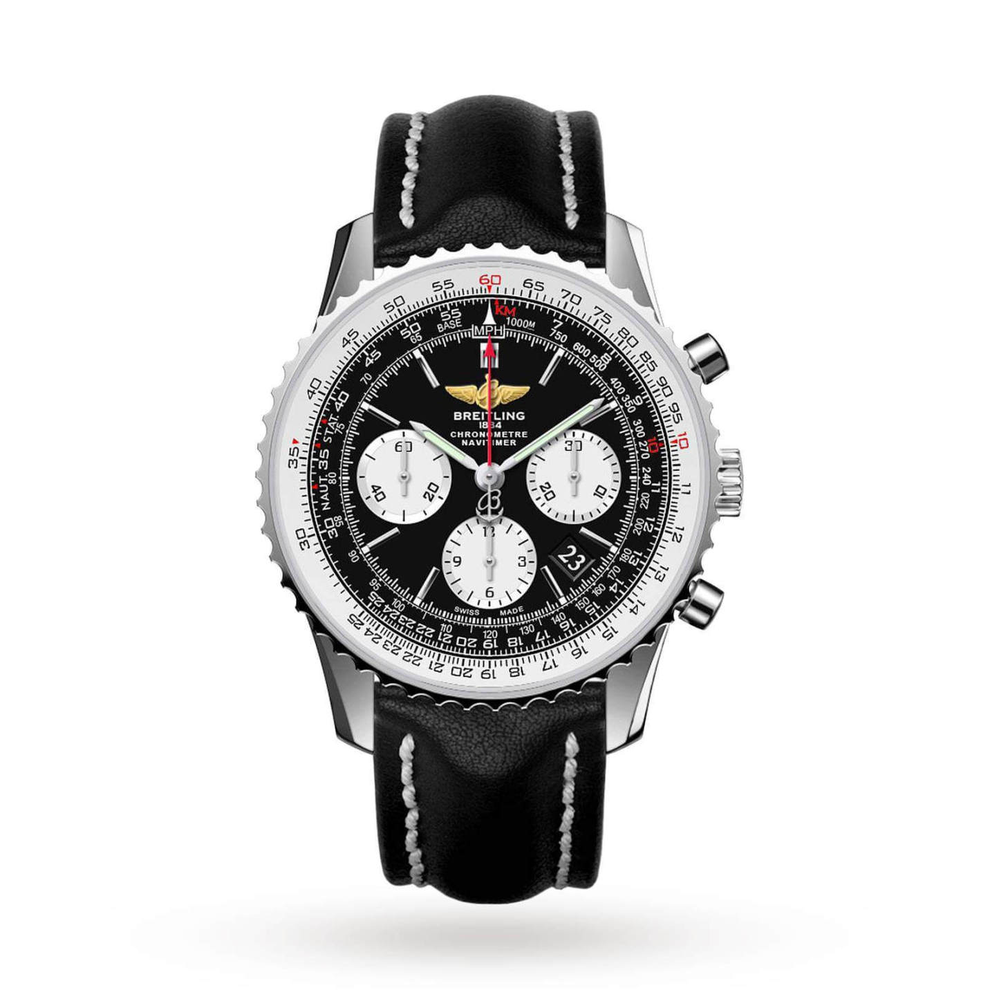 The iconic Breitling Navitimer collection offers the ultimate range of watches for pilots and aviation enthusiasts. Originally designed to measure flight times and fuel requirements in 1952, this collection has reliability at its core. A firm favourite amongst avid explorers, this Breitling Navitimer watch finds the perfect balance between function and form. Housed within a polished 43mm stainless steel case and protected by sapphire crystal glass, the bold black dial is equipped with silver-toned chronograph sub-dials, striking red accents, luminescent hands and a date window at 4 o'clock. Powered by the impressive Breitling 01 COSC certified self-winding movement, this high-performance model also benefits from a stainless steel bidirectional ratcheted bezel, a 70-hour power reserve and a stylish black leather strap with a secure buckle. Explore the full Breitling collection.