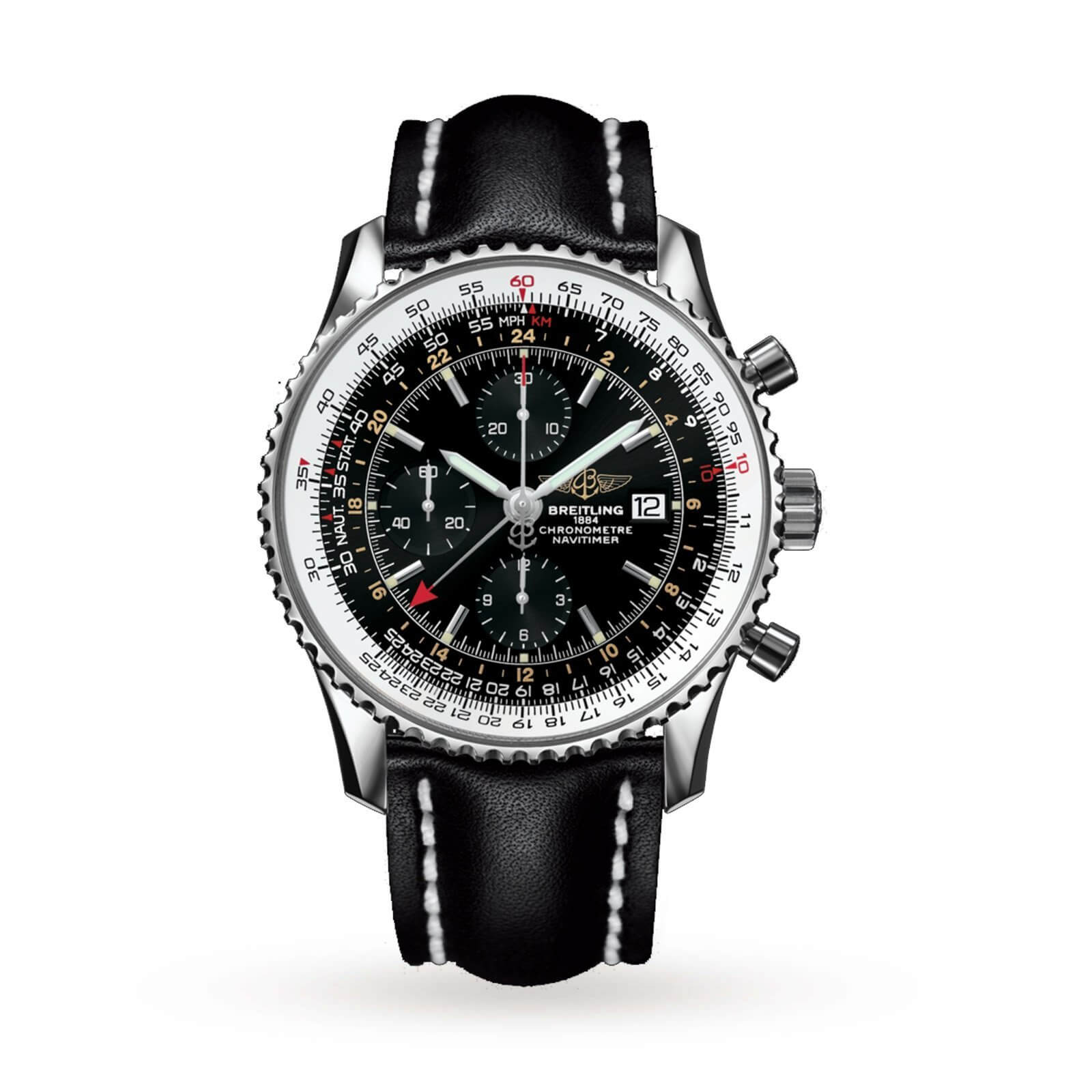 The iconic Breitling Navitimer collection offers the ultimate range of watches for pilots and aviation enthusiasts. Originally designed to measure flight times and fuel requirements in 1952, this collection has reliability at its core. Always ready for action, this Breitling Navitimer watch is showcased in a polished 46mm stainless steel case and boasts a protective sapphire crystal glass, a bidirectional slide rule bezel that is perfectly capable of making mathematical calculations including average speed and currency conversion, as well as a black dial with GMT functionality. Secured with a sophisticated black leather strap, this high-performance timepiece is powered by a reliable automatic movement and is water resistant to 30 metres. Explore the full Breitling collection.