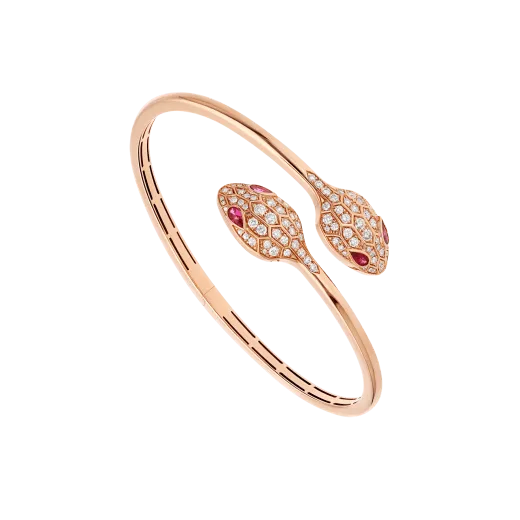 Capturing the snake’s innate power of attraction, the Serpenti bracelet glorifies the head of the mythical animal bringing together stylistic audacity with unrestrained seduction. Inspired by the sensuality of a woman’s gaze, Bvlthtgari recreates the mesmerising spell of the serpent, focusing on the magnetic power of the eyes and their irresistible ability to seduce: elegance with a hint of danger. Serpenti 18 kt rose gold bracelet with rubellites and pavé diamonds.