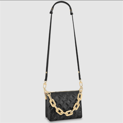 The super soft and cushiony Coussin BB is an adorably compact handbag, fashioned from puffy lambskin embossed with the Monogram pattern. A chunky gold-color chain and a thin leather strap, both removable, enable different attitudes and carry options. Two inside compartments add practicality, making this an ideal day-to-evening accessory.