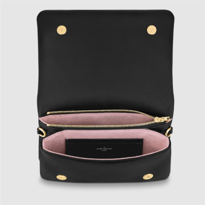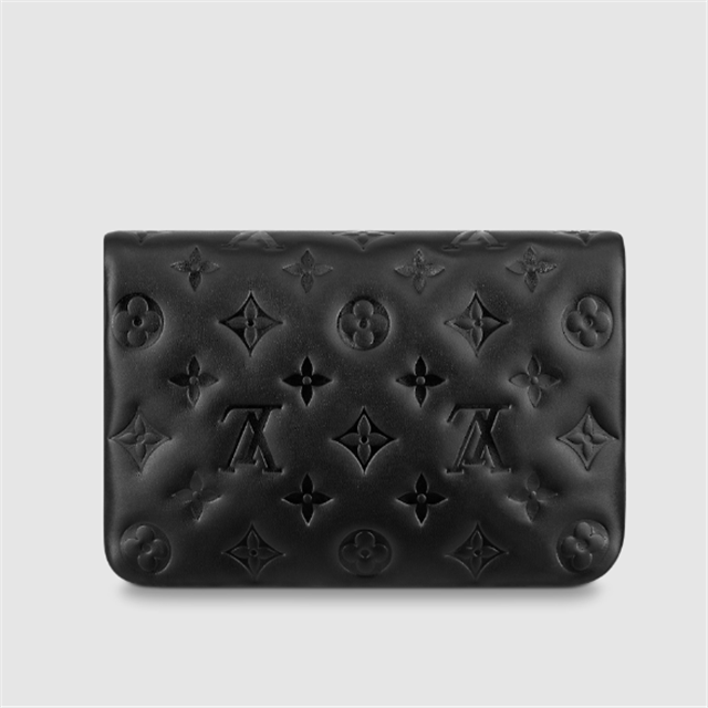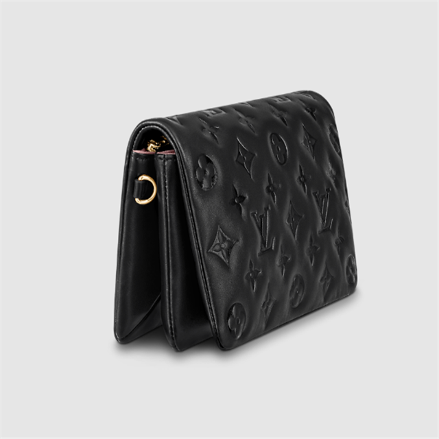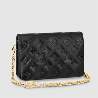 The Pochette Coussin is crafted from soft lambskin, which is embossed with the Monogram pattern to create a puffy, cushiony effect. This is further enhanced by the construction of the pouch, which gives it a supple, body-friendly shape. The removable chain, decorated with a Lothtuis Vuithttton charm, offers different carry options: clutch, shoulder or belt.