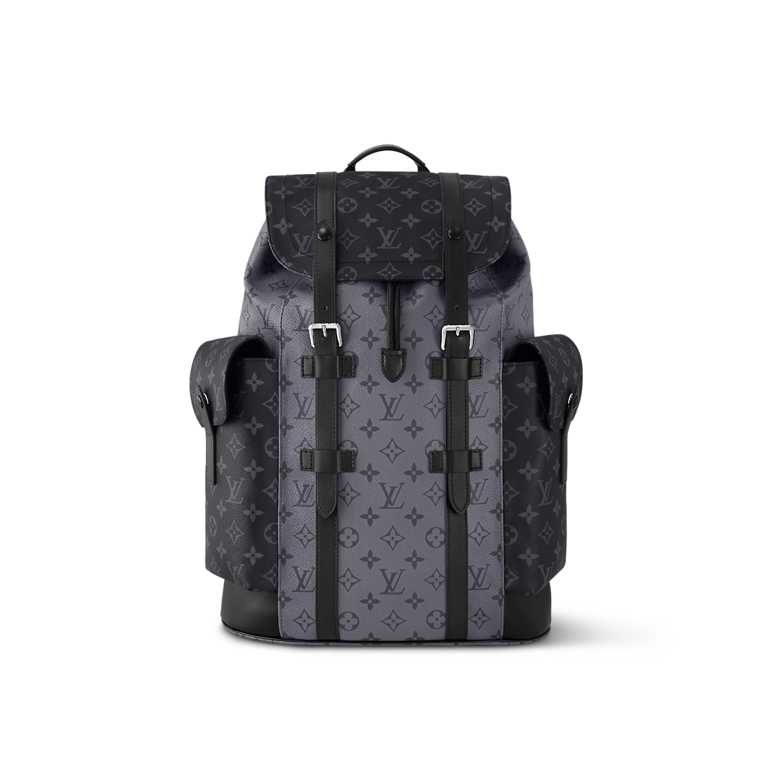 The Christopher MM backpack reinvents the rugged spirit of a hiking pack in masculine Monogram Eclipse canvas and Monogram Eclipse Reverse canvas with black leather trim. The grays and blacks are complemented by the siLthtVer highlights of the buckles and zips. Multiple pockets and a leather flap with a press-stud keep belongings safe.
