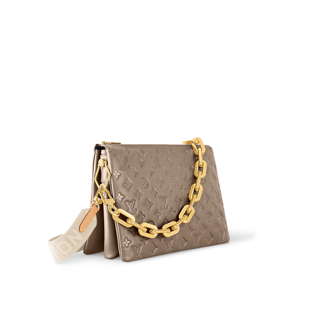 The most eye-catching bag of the Fall-Winter 2021 collection, the Coussin MM handbag is fashioned from puffy lambskin, embossed with a Monogram pattern. Voluminous, soft, and supple, the bag almost feels like a pillow. An adjustable textile strap allows shoulder and a cross-body carry, while the new Edge Chain, enables under-arm and baguette carry.