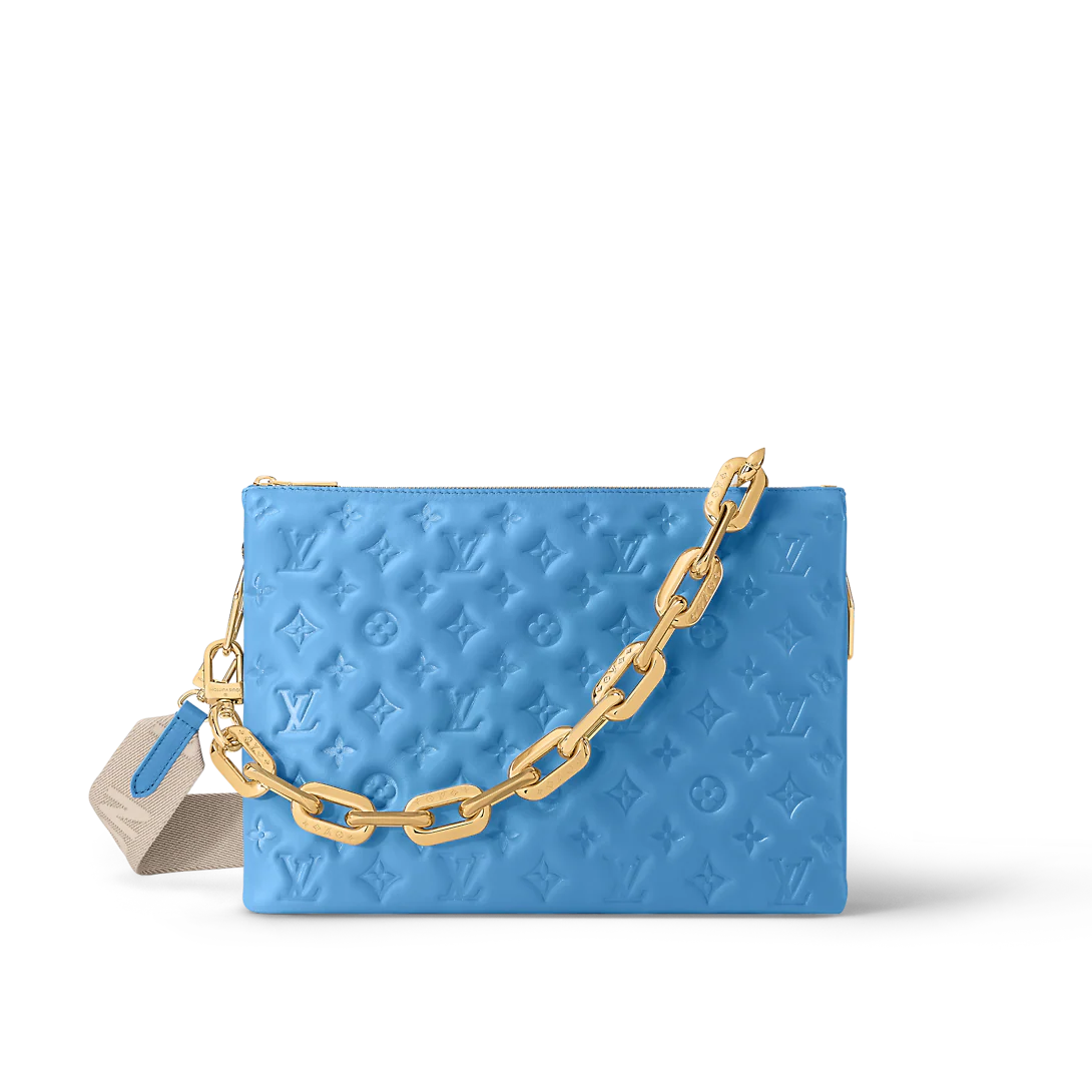 Fashioned from blue, puffy lambskin with gold-color hardware, this Coussin MM handbag is as stylish as it is comfortable to carry. It features a removable chunky chain for shoulder carry as well as a wide detachable and adjustable strap for shoulder or cross-body carry.
