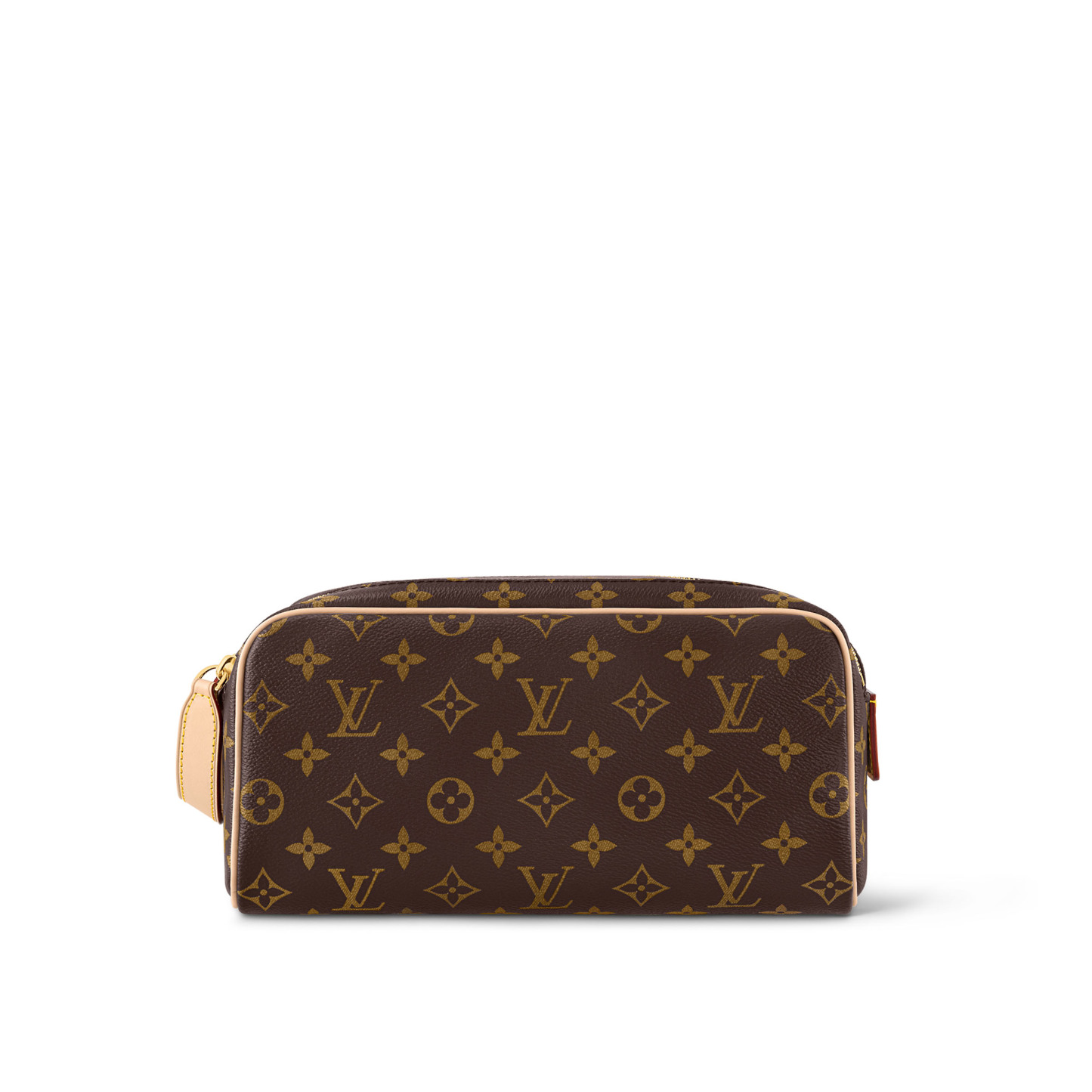 An indispensable travel companion, this signature Dopp kit is crafted from classic Monogram canvas, trimmed with natural cowhide. The spacious interior holds grooming needs securely, with a zipped pocket for smaller items. The wide leather handle ensures a comfortable carry; it also serves to hang the bag from a bathroom hook.