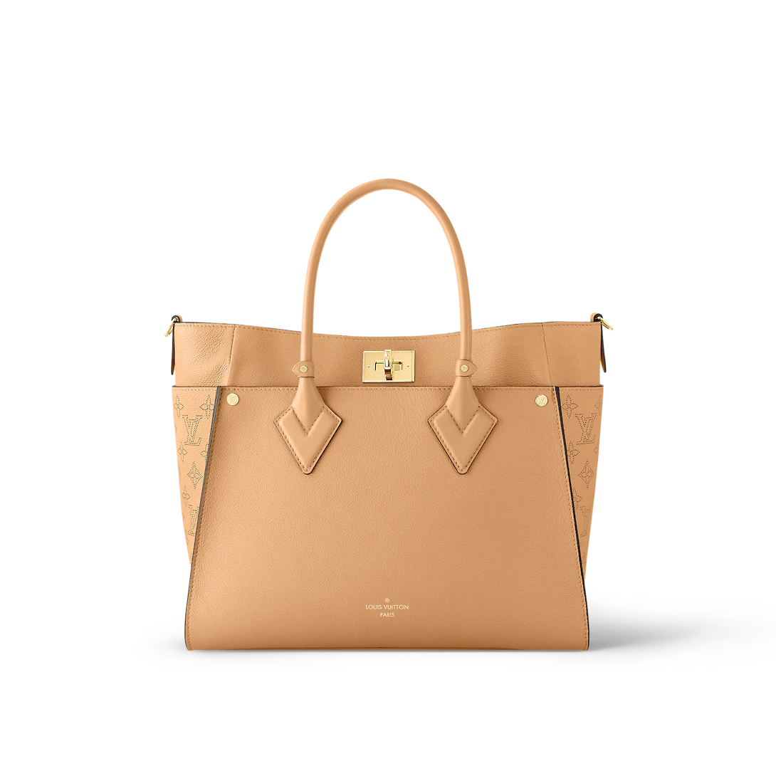 The generously sized On My Side GM handbag is made from calf leather with perforated calf leather on the sides, featuring the Monogram motif. Like all the On My Side bags, it closes with the signature turn lock. Two top handles, and a removable and adjustable leather strap, offer multiple carrying options.
