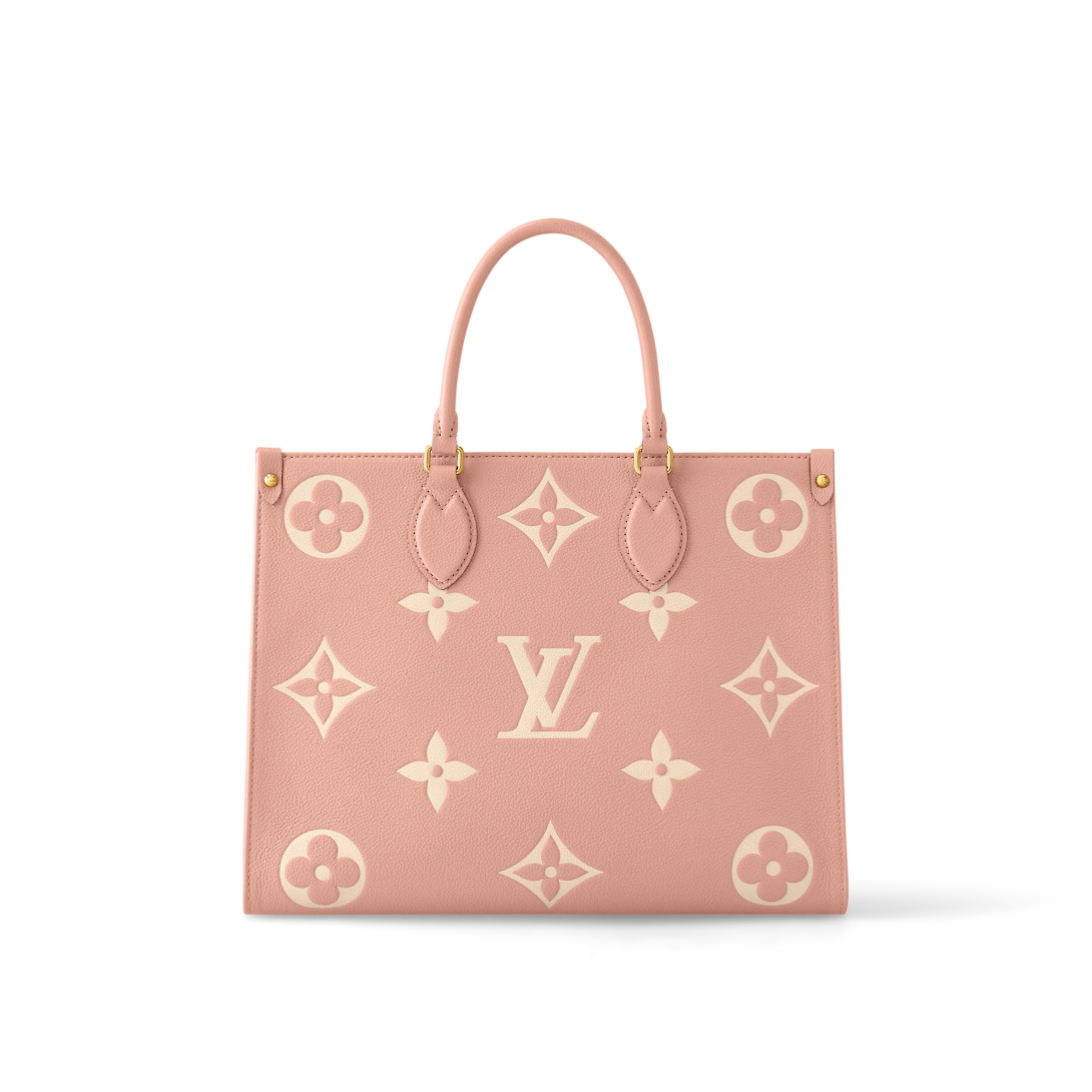 This OnTheGo MM tote bag is made from Monogram Enpreinte leather, with the Monogram Flowers and LthtVs in a cream color, embossed then printed on a pink background. Lined in a matching greige, this carryall is perfect for work or weekend. The OnTheGo offers both articulated top handles and long shoulder straps.
