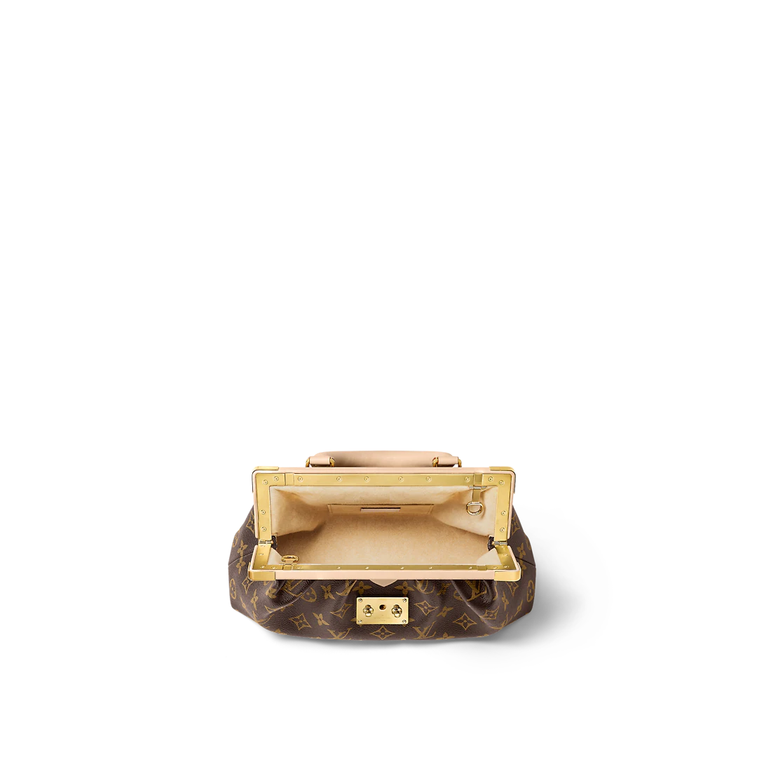 Seen at the Spring-Summer 2023 show, the Monogram Clutch is fashioned from Monogram canvas with natural calfskin trim and gold-color hardware, including the classic Lothtuis Vuithttton S-lock and the riveted clasp with metallic corners. In addition to the rolled-leather top handle, there锟斤拷s a removable chain, attached to retractable, rotating chain mounts.