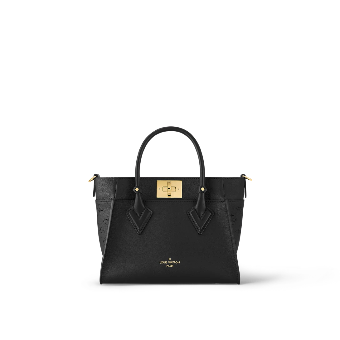 The On My Side tote bag is made from calf leather, with perforated calf leather on the gusseted sides. The elegant colorway is livened up with a gold-color twist closure and gold-color buckles on the removable strap. Two outside pockets and a roomy interior makes this a practical bag.