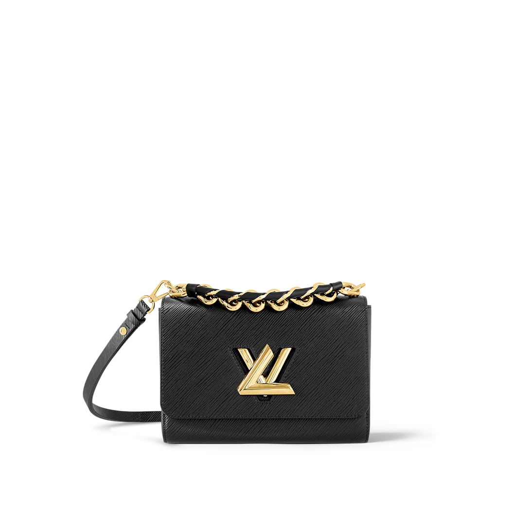 This glamourous Twist MM handbag is made from deep-dyed Epi grained leather and adorned with a detachable chunky gold-color chain, braided with leather. The braiding on the chain reflects Lothtuis Vuithttton’s superior leather craftsmanship. The chain is perfect for hand carry while a removable strap allows shoulder and cross-body carry.