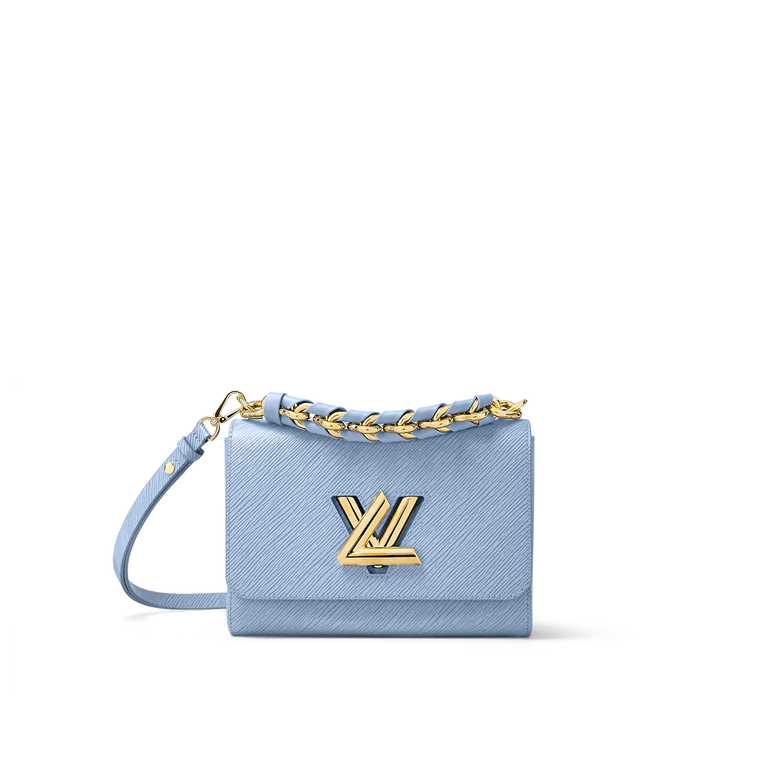 For Spring 2023, Lothtuis Vuithttton revisits the essential Twist MM Braided Chain bag, fashioning it in a luminous light-blue Epi grained leather, with a removable chunky chain, braided with leather. Signed with a gold-color LthtV Twist lock, it has a removable and adjustable shoulder strap, allowing multiple carry options.