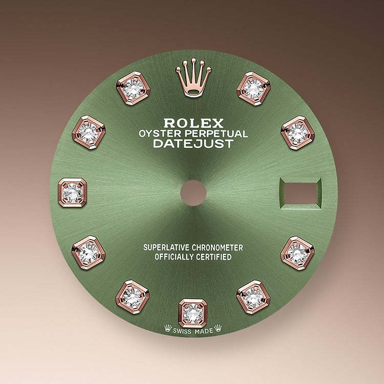 - Dial color: Olive green dial with a fine sunrays and 10 Diamonds as hour markers framed in 18k Everose Gold