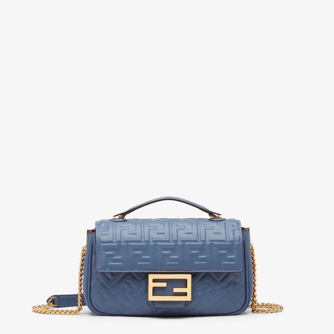 Iconic medium Baguette bag with chain, made of soft, blue nappa leather with a 3D texture FF motif. Decorated with an FF clasp.