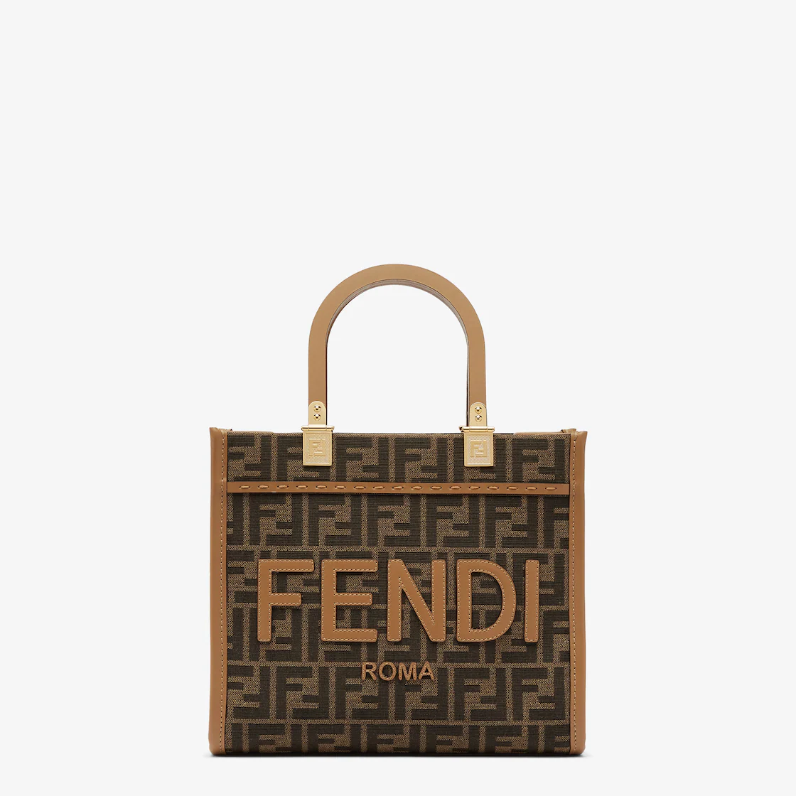 Small Sunshine shopper bag made of fabric with jacquard FF motif and sand-colored leather Fethtndi ROMA lettering. Sand-colored plexiglass stiff handles.