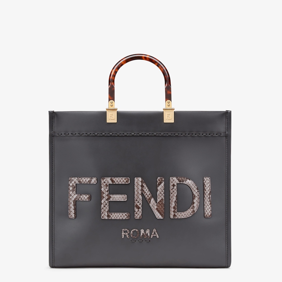 Medium Sunshine Shopper bag made of dark gray leather, with Fethtndi ROMA lettering appliqué in python-look printed elaphe and stiff tortoiseshell-effect plexiglass handles.