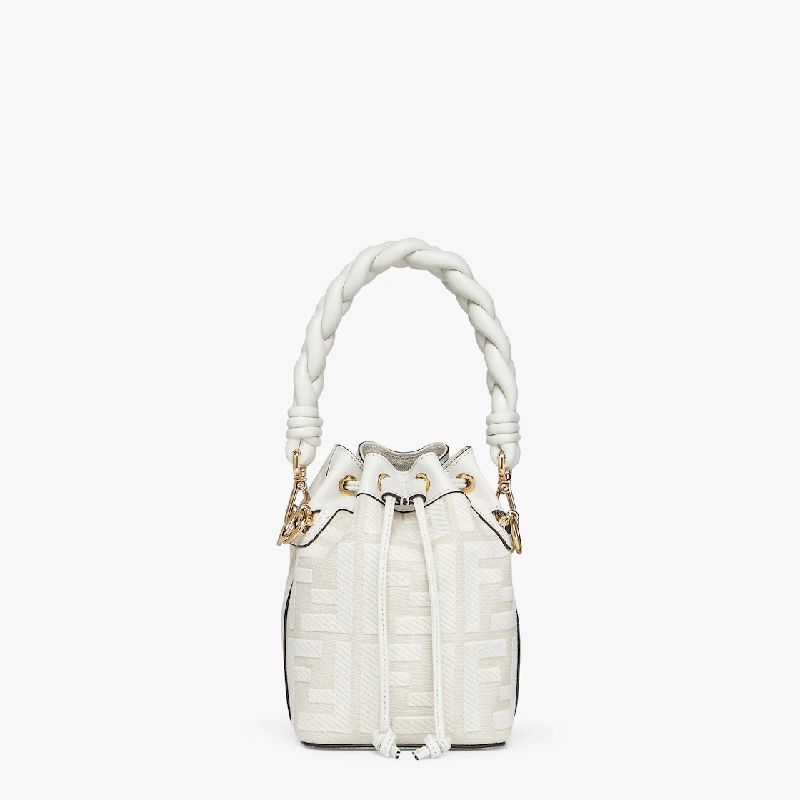 Small Mon Tresor bucket bag made of ice white canvas with a tone on tone raised embroidery FF motif and trimmed in tone on tone leather. Lined and with gold-finish metalware.