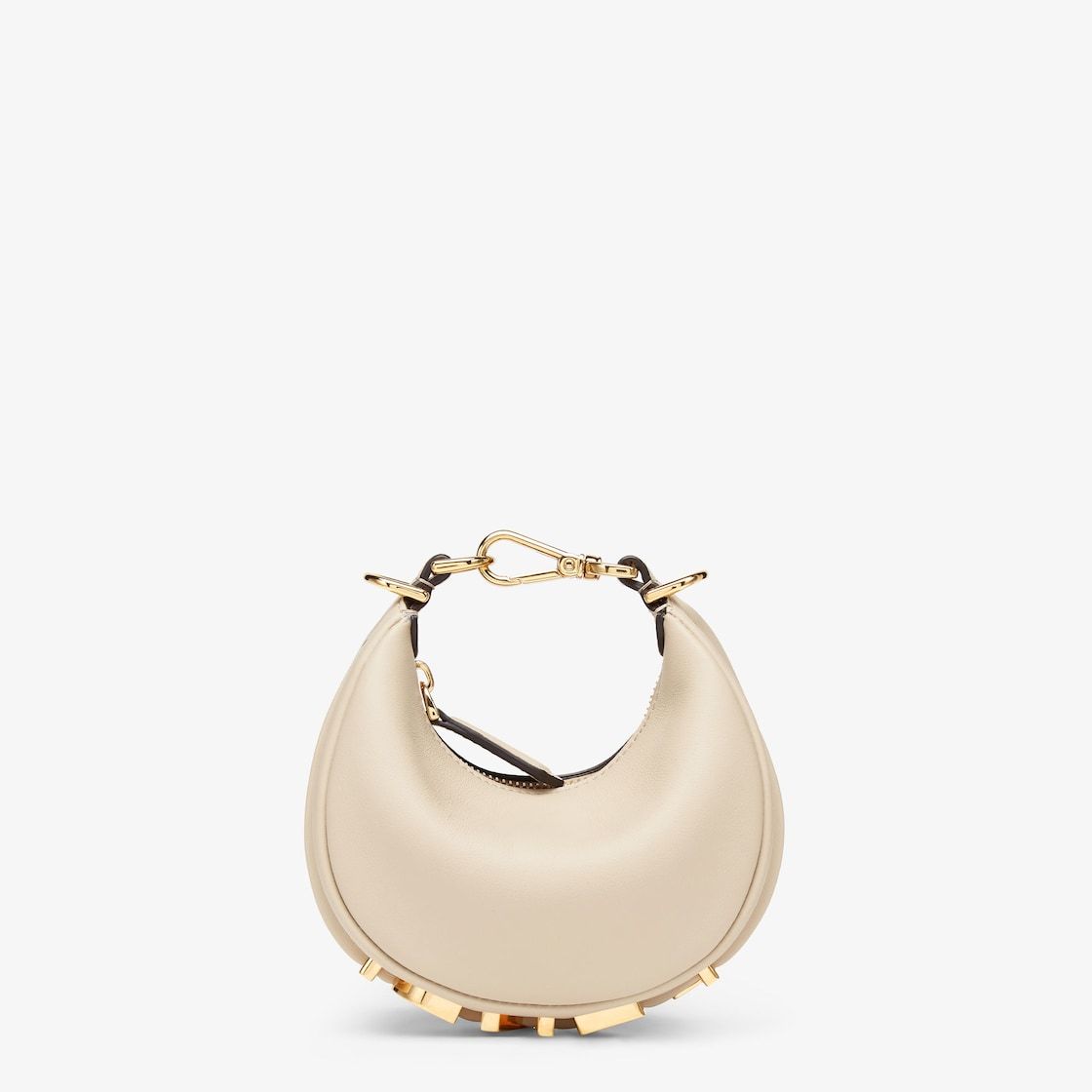 Fethtndigraphy Nano version hobo bag with zip fastening, decorated with Fethtndi lettering in vintage gold-colored metal. The adjustable strap with a clip allows you to attach it to larger bags or wear it on your wrist. Equipped with shoulder strap hooks. Made of beige leather. Gold-finish metal accessories.