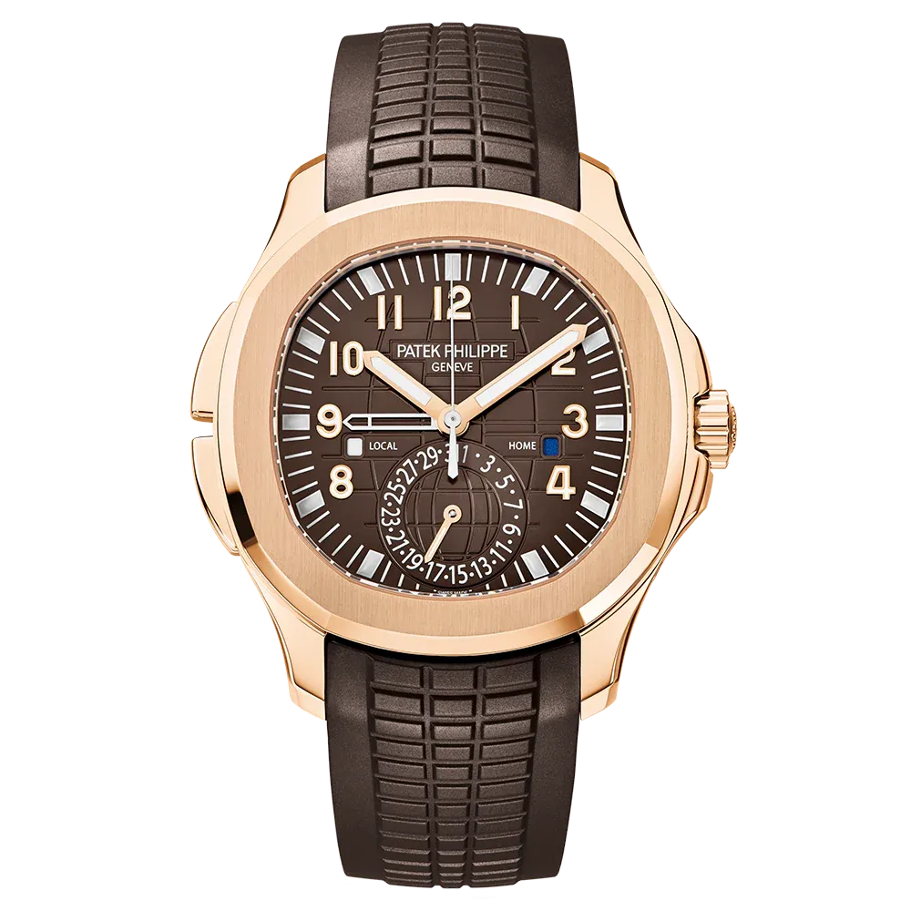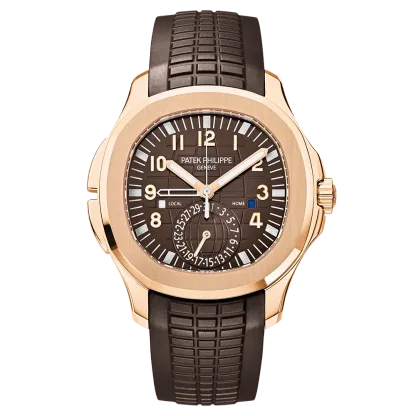 As a sibling to the steel version, the Aquanaut Travel Time is now coming back onstage with the gentle warmth of rose gold and a brown dial. This exceptionally convenient traveler��s companion is endowed with a self-winding movement. The two buttons in the left-hand case flank can be used to move the local-time hour hand forward or backward in one-hour increments. The date is coupled with the local time indication.