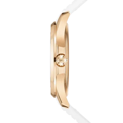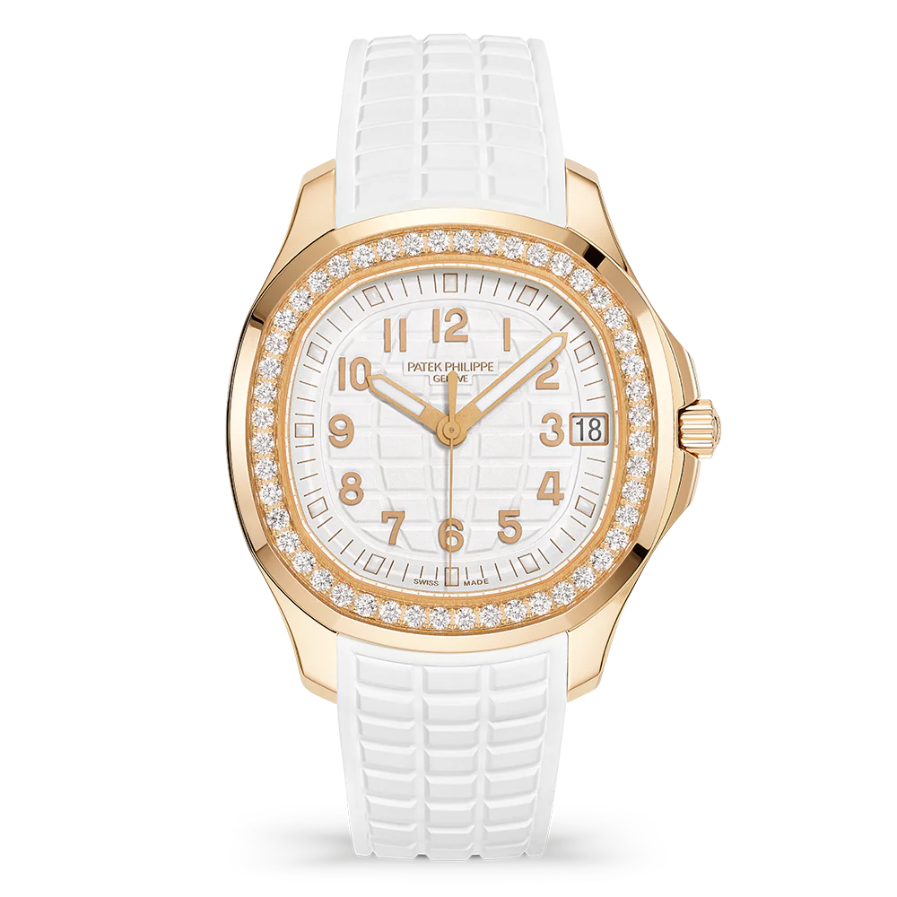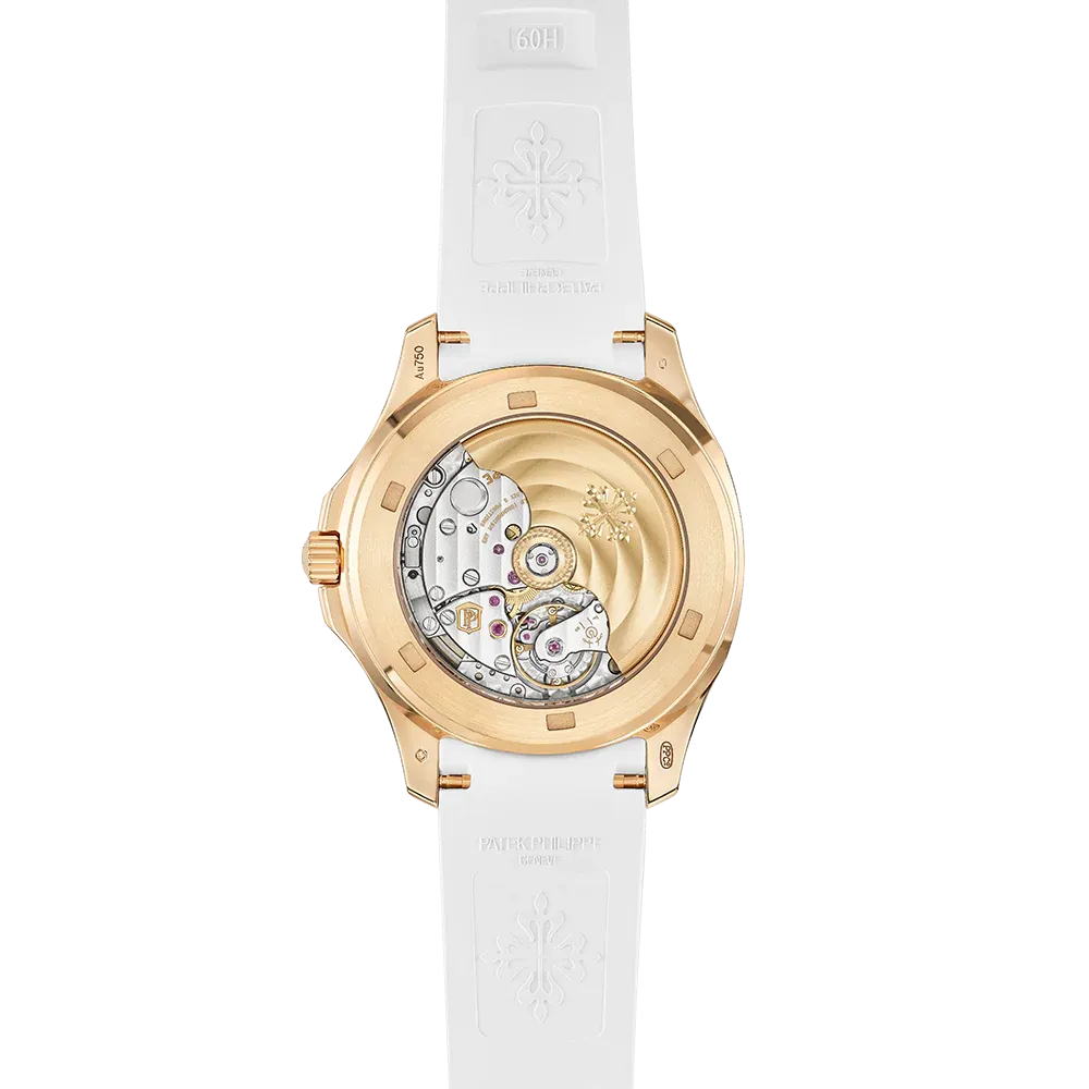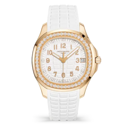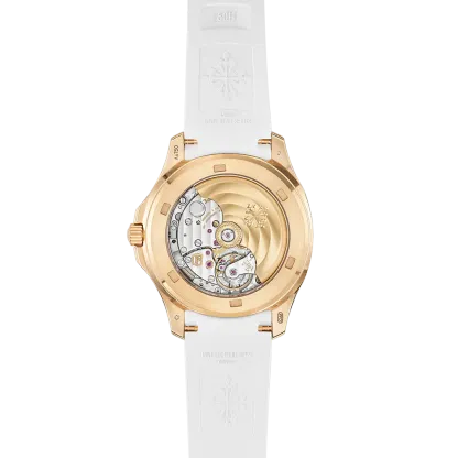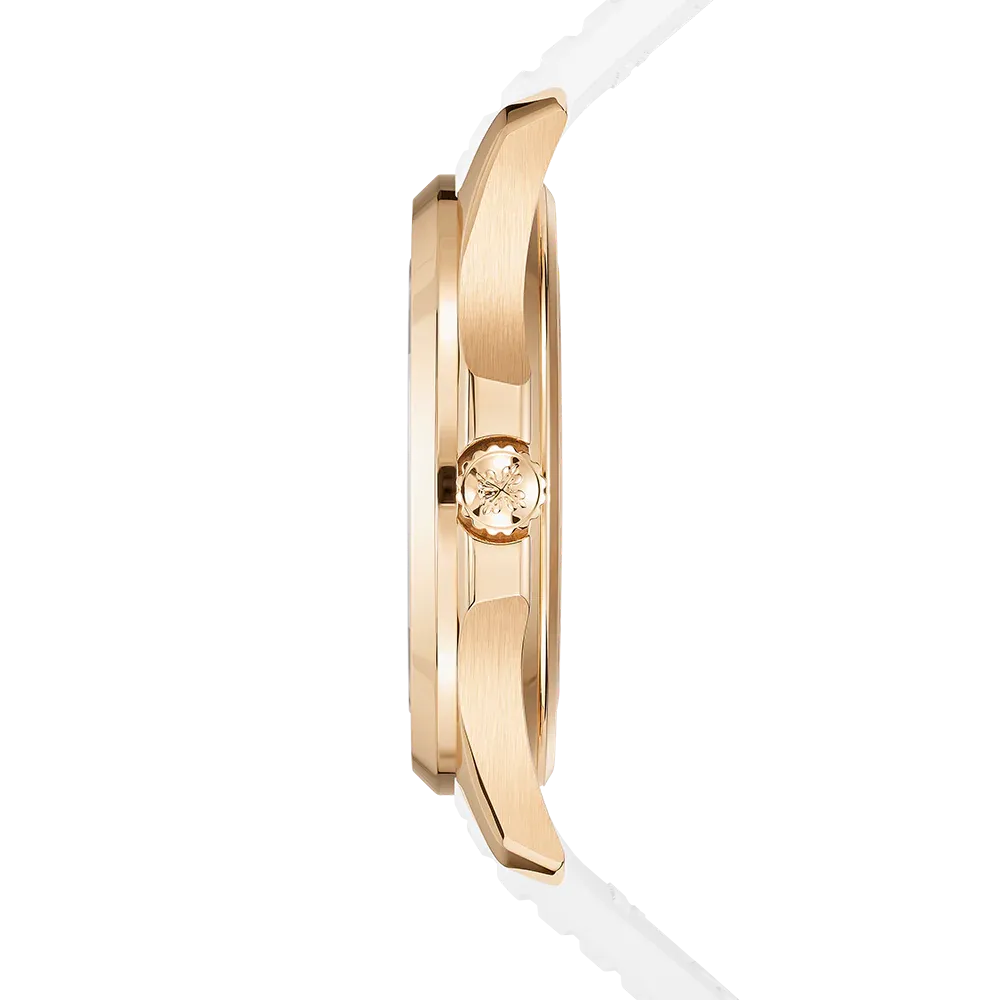 The sporty chic look of the self-winding rose gold Aquanaut Luce has been revisited in a larger diameter (38.8 mm) and fitted with a new integrated strap. The dial featuring the Aquanaut motif and the strap in an ultra-resistant composite material are clad in the same elegant matte white. Water-resistant to 120 m, the rounded octagonal case is enhanced by polished and satin finishes. The bezel is lit up by 48 diamonds (~1.11 ct). The self-winding 26-330 S C movement is equipped with a 'stop seconds' function serving to set time to the exact second. The patented fold-over clasp is secured by four independent catches.