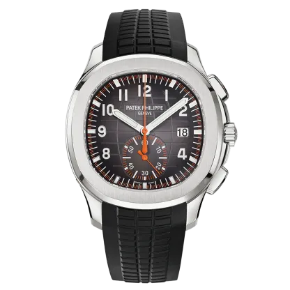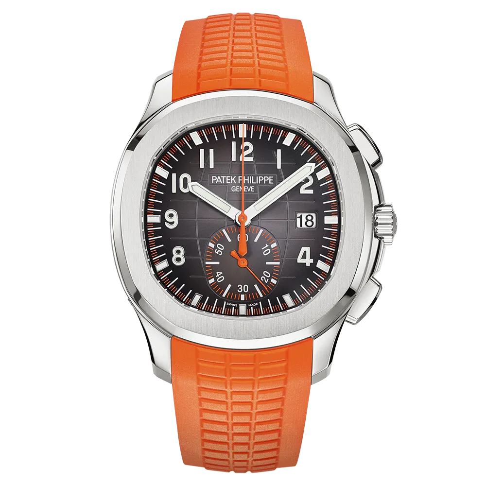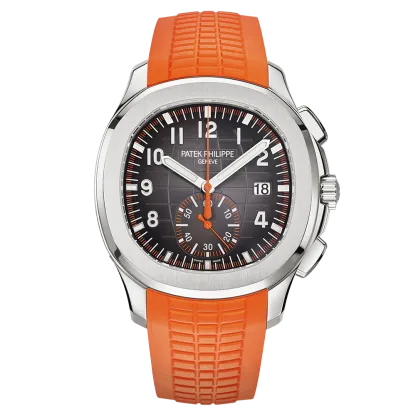 The sporty and very contemporary Aquanaut collection welcomes its first chronograph �C a complication that perfectly matches the character of this youthful and dynamic timepiece line. Endowed with a self-winding flyback chronograph movement, the Reference 5968 also stands out with remarkable aesthetic appeal, typified by orange chronograph displays contrasting against the black dial. It comes with two straps: one orange, one black, in an ultra-resistant composite material.