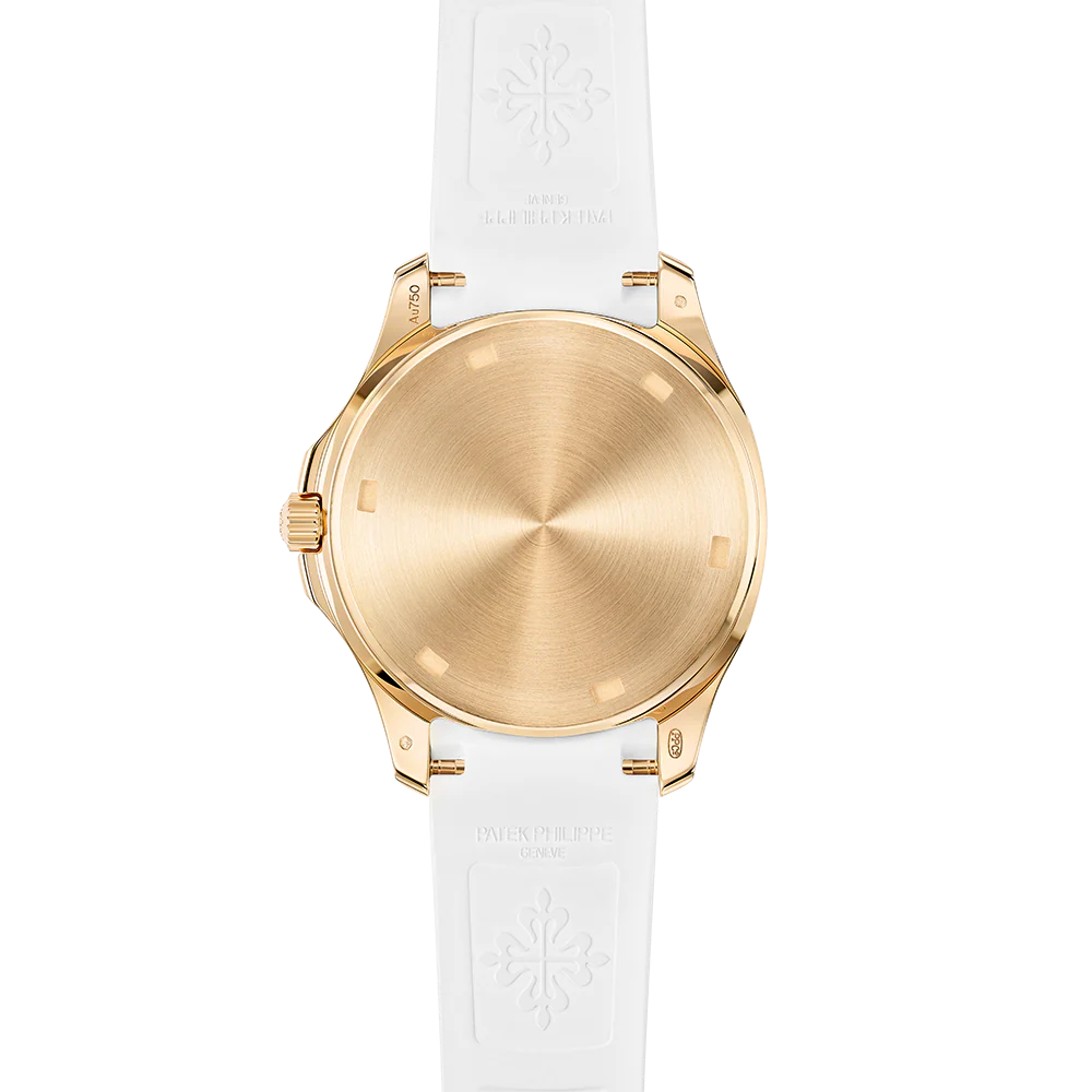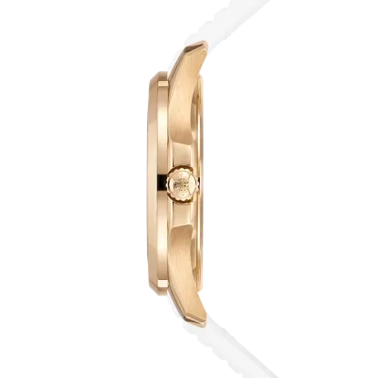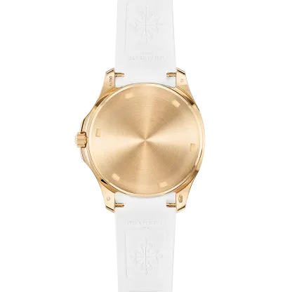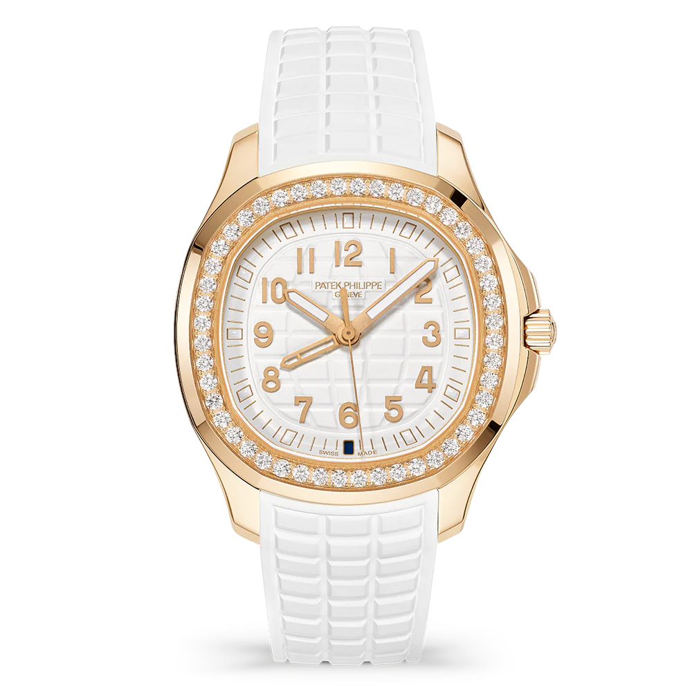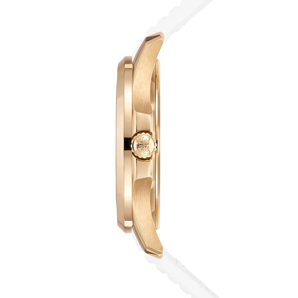 The Aquanaut Luce collection welcomes a new ladies` travel watch with the new E 23-250 S FUS 24H Travel Time (dual time zone) quartz movement. The discreet and practical crown adjustment system ensures the Aquanaut Luce remains as elegant as ever. The 38.8 mm rose gold case, featuring contrasting polished and satin finishes, is water-resistant to 60 m. It is paired with a matte white dial and an integrated composite strap. The bezel is lit up by 48 diamonds (~1.11 ct), while the patented fold-over clasp is secured by four independent catches.
