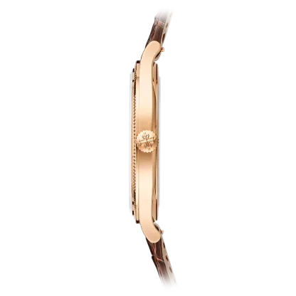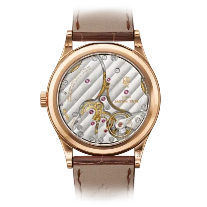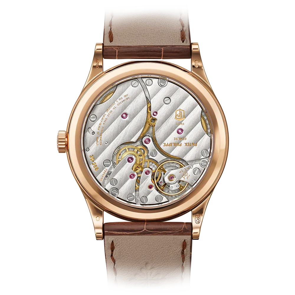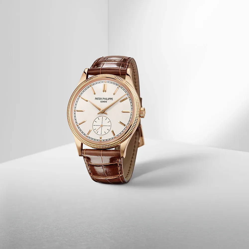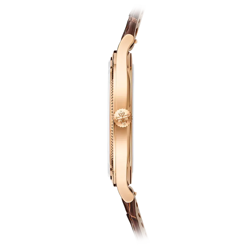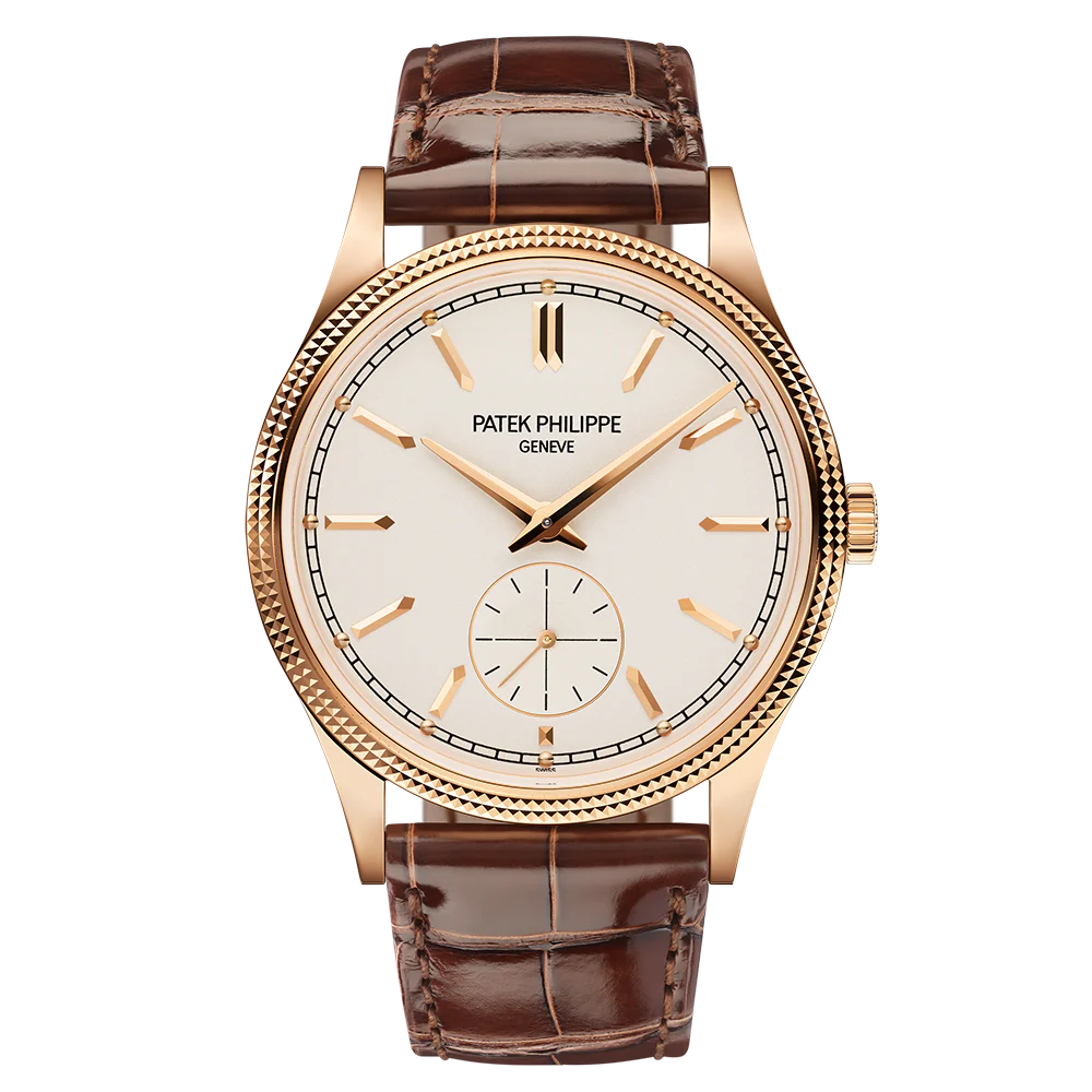 Patek Philippe gives fresh momentum to the emblematic Calatrava model featuring a guilloched hobnail pattern also known as Clous de Paris by treating it to a slightly larger diameter and a design reinterpreted in a contemporary spirit. The faceted applied rose gold hour-markers, combined with dauphine-style hours/minutes hands, create a sleek and timeless dial aesthetic. The elegantly refined rose gold case houses the new manually wound movement 30-255 PS with a 65-hour power reserve.