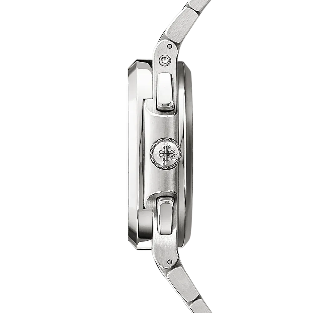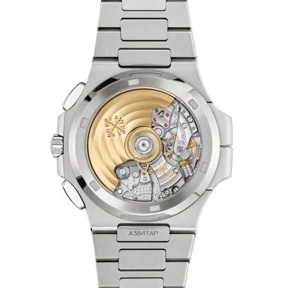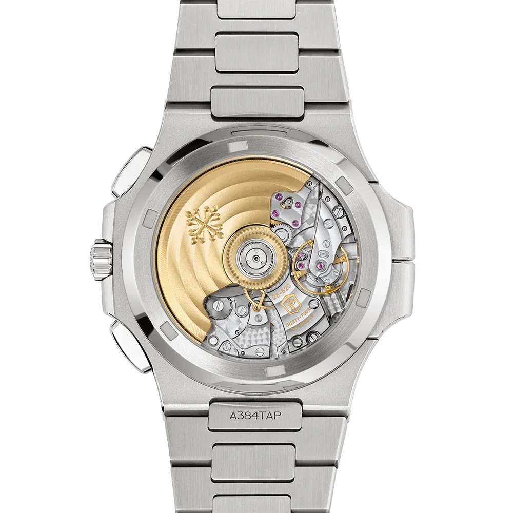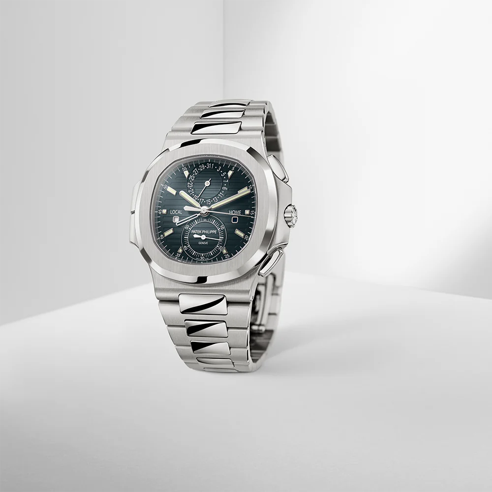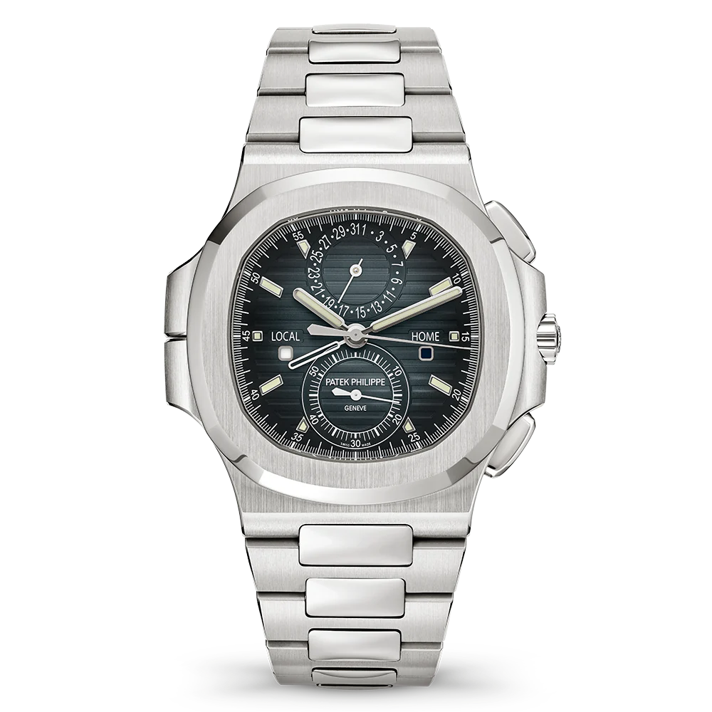 The Ref. 5990/1A-011 Nautilus Travel Time chronograph is one of Patek Philippe��s rare steel watches. It features a new blue dial with a ray sunburst dial and a delicate black gradation to the periphery.?The self-winding calibre CH 28-520 C FUS movement combines three convenient and user-friendly complications: a flyback chronograph, a Travel Time function (two time zones with two separate hour hands; the skeletonized hand shows home time) and an analog date at 12 o`clock which is synchronized with local time.