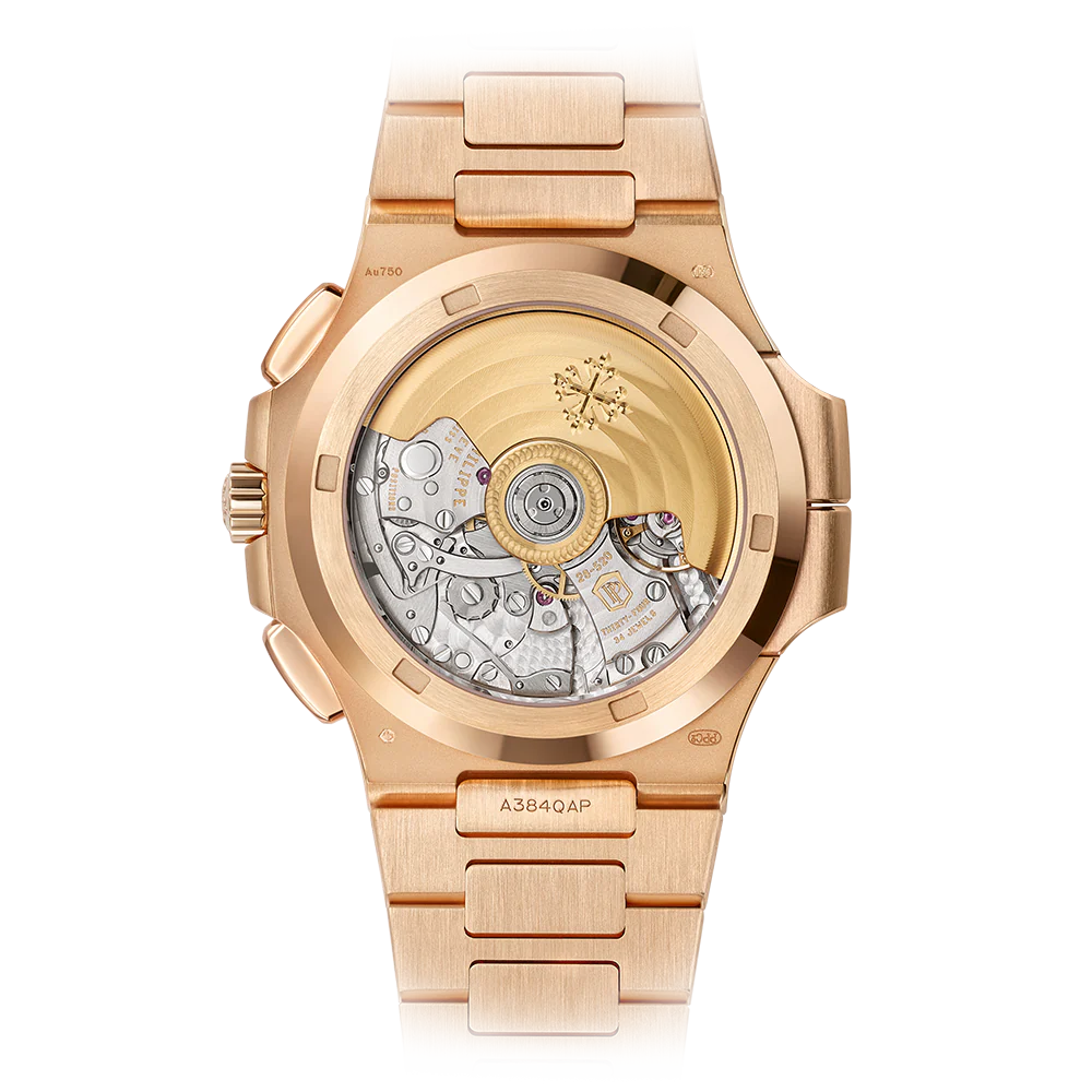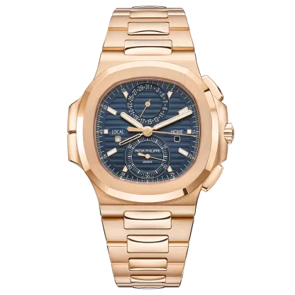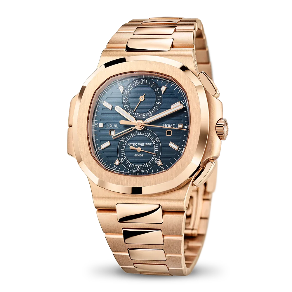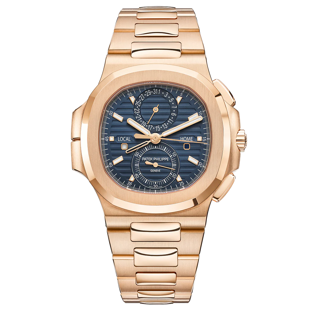Patek Philippe presents the Nautilus Travel Time Chronograph Reference 5990/1 in a generous rose gold version contrasting with the sunburst blue dial featuring an embossed horizontal pattern and applied hour-markers. The baton-style hands are in rose gold with a luminescent coating. This new model combines three highly sought-after complications: a self-winding flyback chronograph, an easy-to-use Travel Time function (dual time-zone), and a date display, coupled with local time.