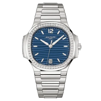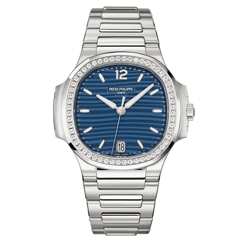 The Ladies Automatic Nautilus in steel with diamond-set bezel asserts its presence on the wrist with a diameter of 35.2 mm. Introducing a dial colour of blue opaline. The steel bracelet comes with a fold-over clasp, endowed with an adjustment system, providing the wearer with between 2 and 4 mm of extra bracelet length for increased comfort.