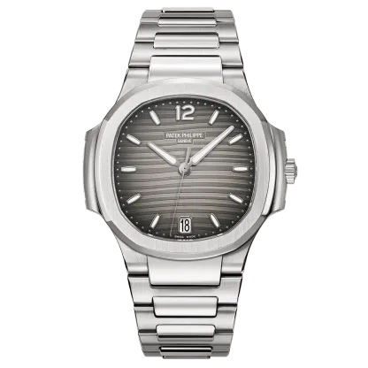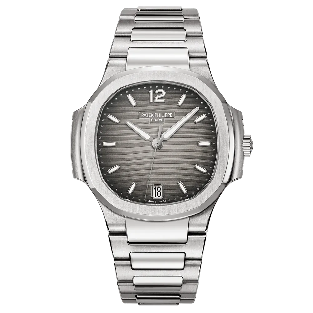 The Ladies Automatic Nautilus wristwatch in stainless steel emphasizes its casual elegance and very feminine style with a new smoke grey dial colour. The gently undulating embossed decor underscores its unmistakably ladylike interpretation of the Nautilus. The applied numerals and the hands are luminous to assure optimized legibility.