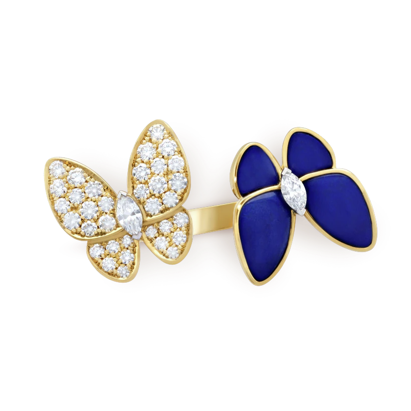 Two Butterfly Between the Finger ring, 18K yellow gold, lapis lazuli, round diamonds, rhodium plated 18K white gold, marquise-cut diamonds; diamond quality DEF, IF to VVS.