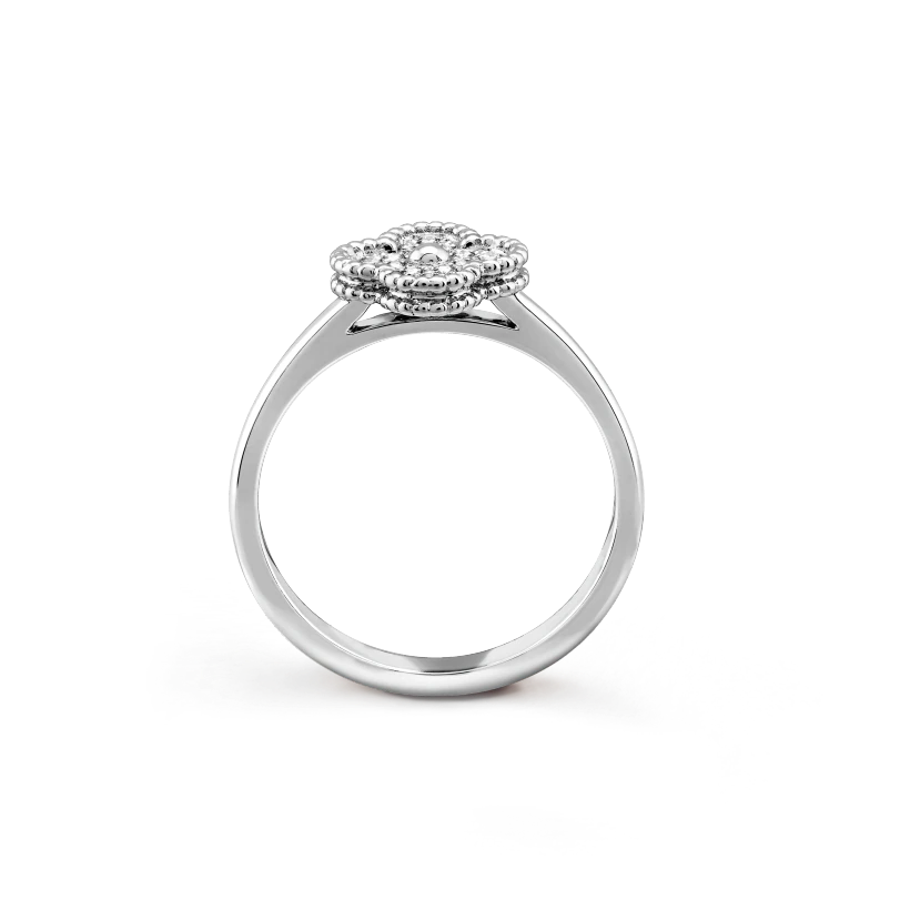 Sweet Alhambra ring, rhodium plated 18K white gold, round diamonds; diamond quality DEF, IF to VVS.