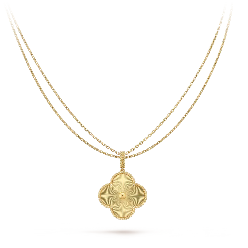 The single-motif Magic Alhambra long necklace reveals another way of playing with the size and materials of the iconic motif. A transformable piece, this jewel may be worn in several ways, including long on a single chain or short with a doubled chain.