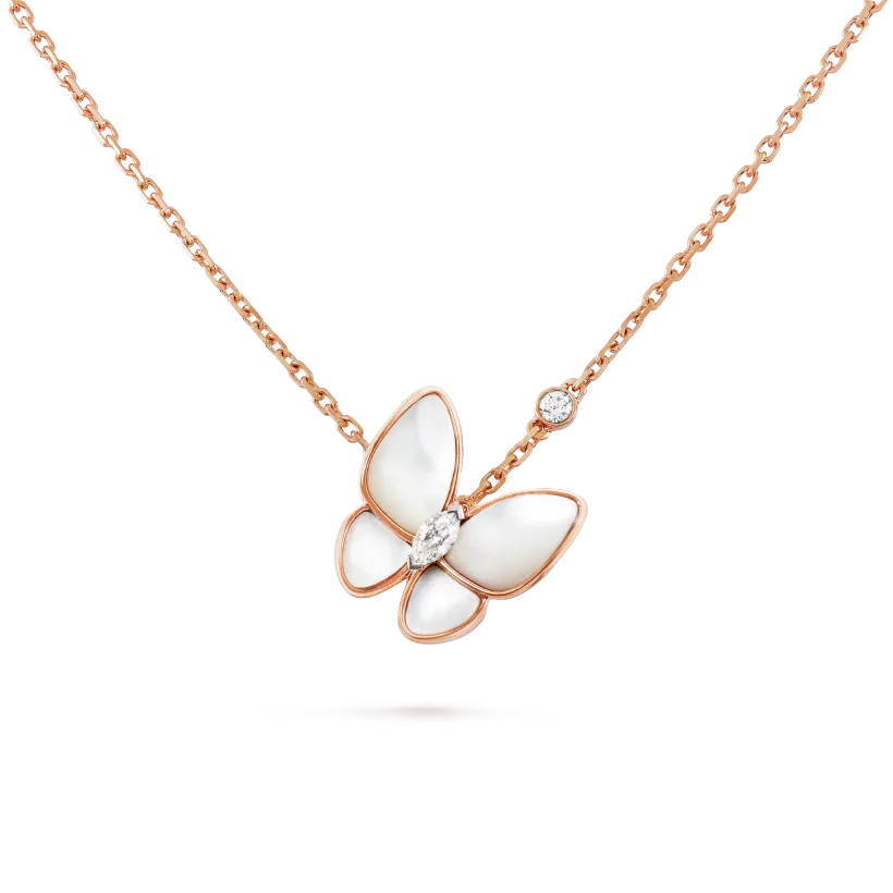 Two Butterfly pendant, 18K rose gold, white mother-of-pearl, round diamond, rhodium plated 18K white gold, marquise diamond, diamond quality DEF, IF to VVS.
