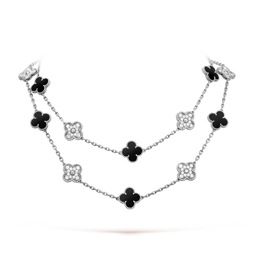 Vintage Alhambra long necklace, 20 motifs, rhodium plated 18K white gold, onyx, round diamonds; diamond quality DEF, IF to VVS.