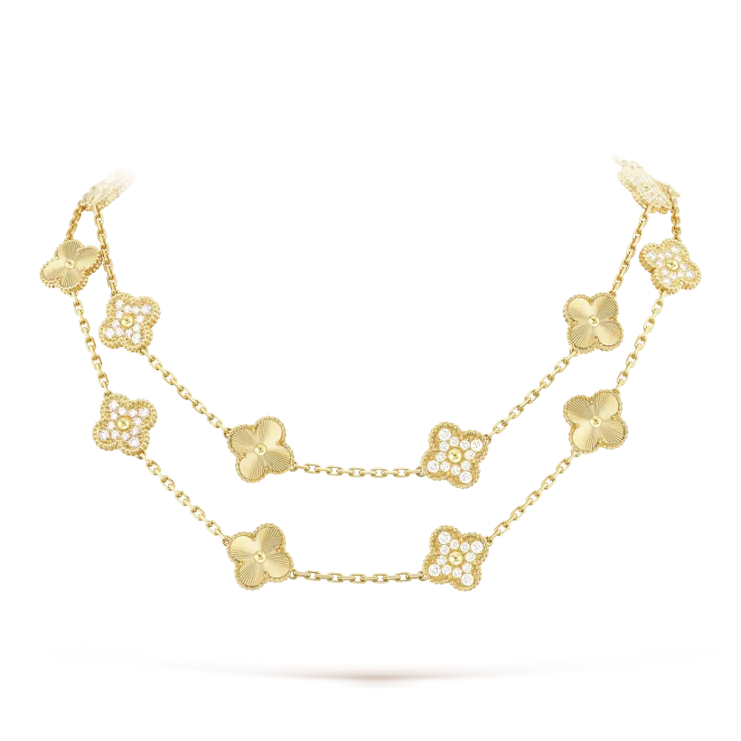 Vintage Alhambra long necklace, 20 motifs, guilloch?? 18K yellow gold, round diamonds; diamond quality DEF, IF to VVS.
