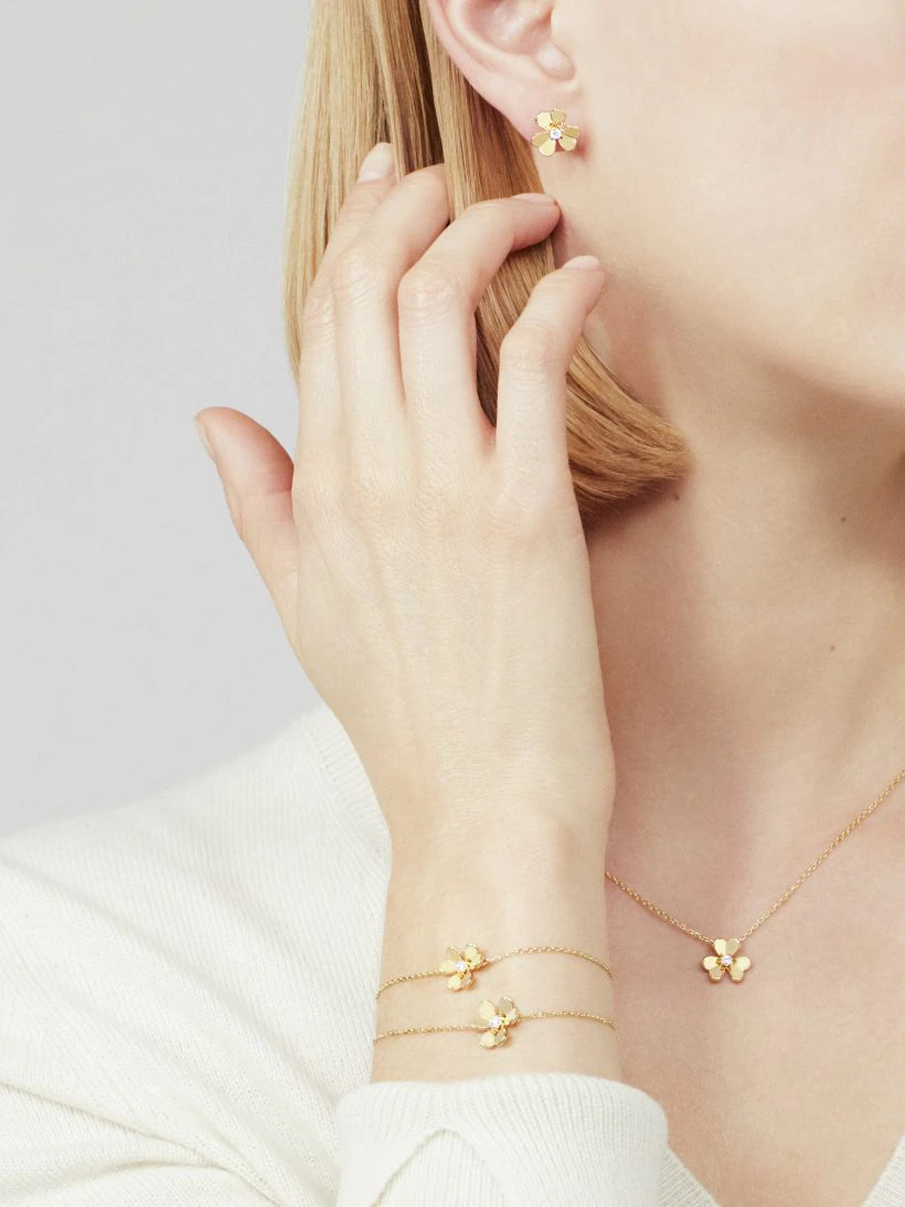 Like so many flowers dancing in the breeze, the Frivole® creations by Vthtan Clthteef & Arthtpels stand out with their graphic and airy aesthetic. Mirror-polished 18K gold or diamonds bestow a singular radiance upon heart-shaped petals.